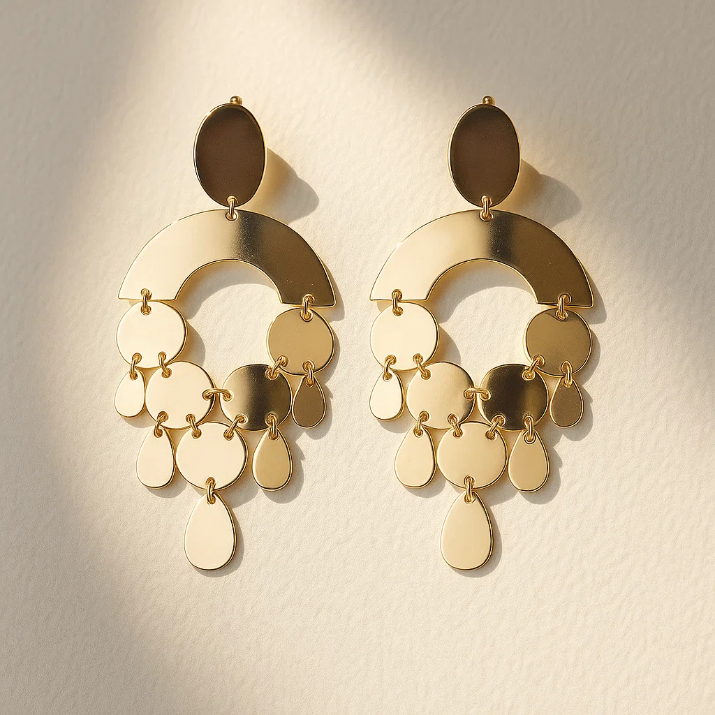 Aros de plata esterlina 925 con recubrimiento en oro amarillo 18k pulido, con diseño de discos, óvalos y gotas en  Chandelier. Largo 95mm