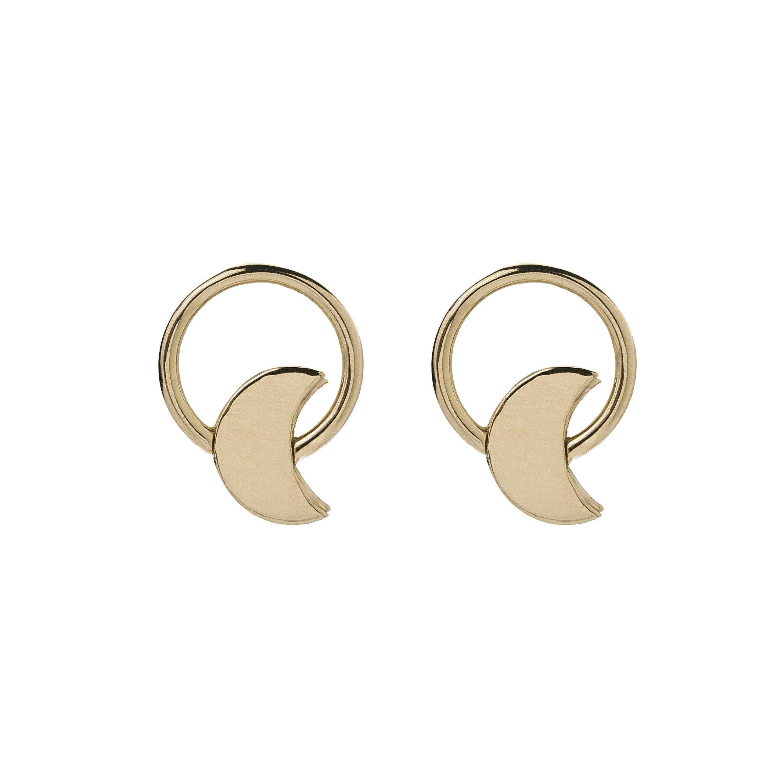 Aros de Oro Amarillo 18k con diseño de circulo con figura de media luna en la parte de abajo, cierre de tornillo.