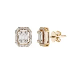 Aros de Oro Amarillo 18k rectangulares con diamantes en corte Baguette 0.17ct y Brillantes 0.14ct, con un halo de brillantes en pave.