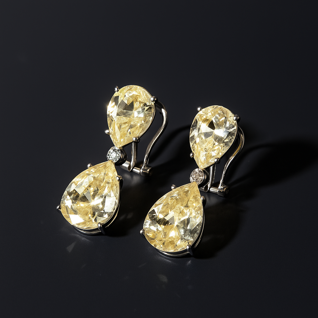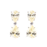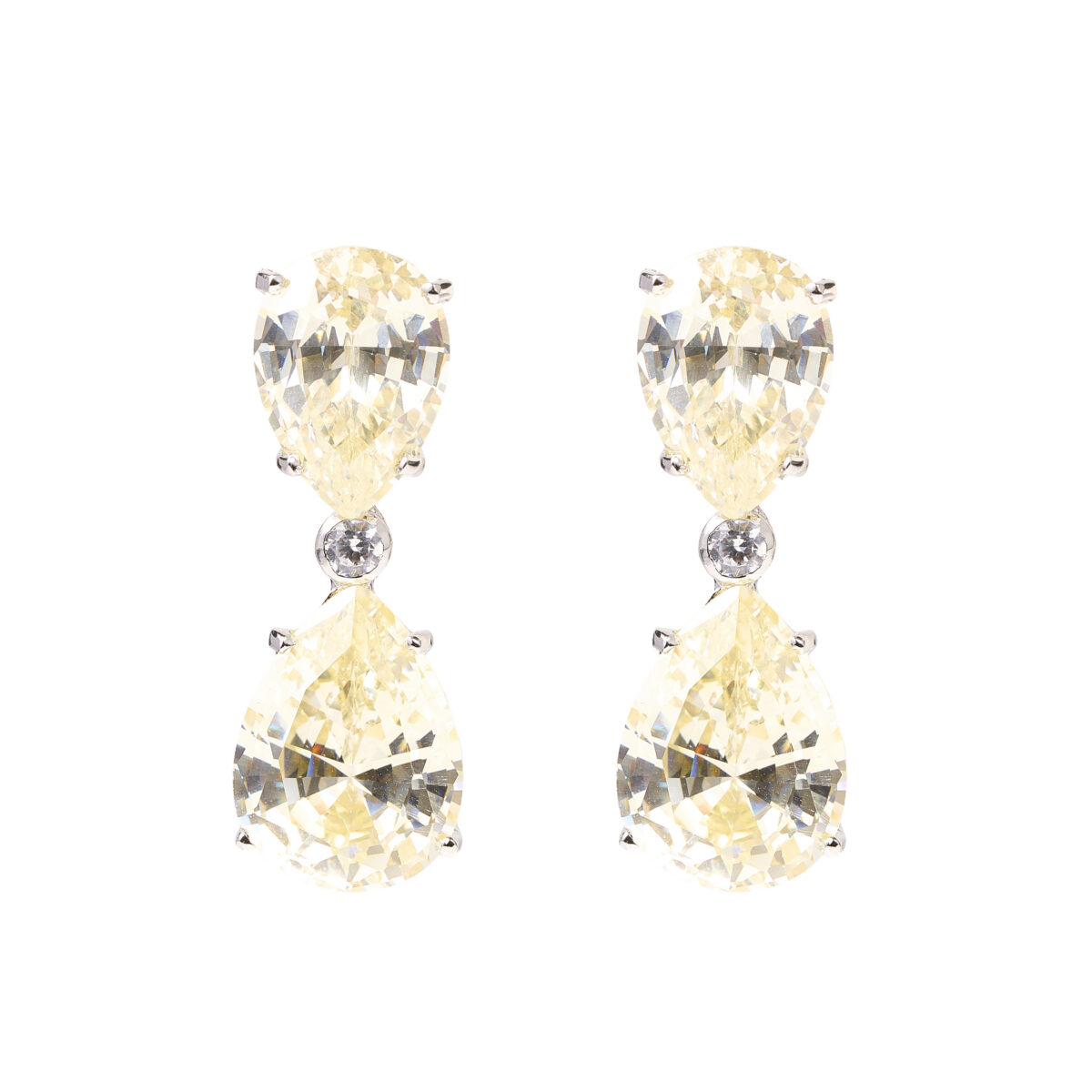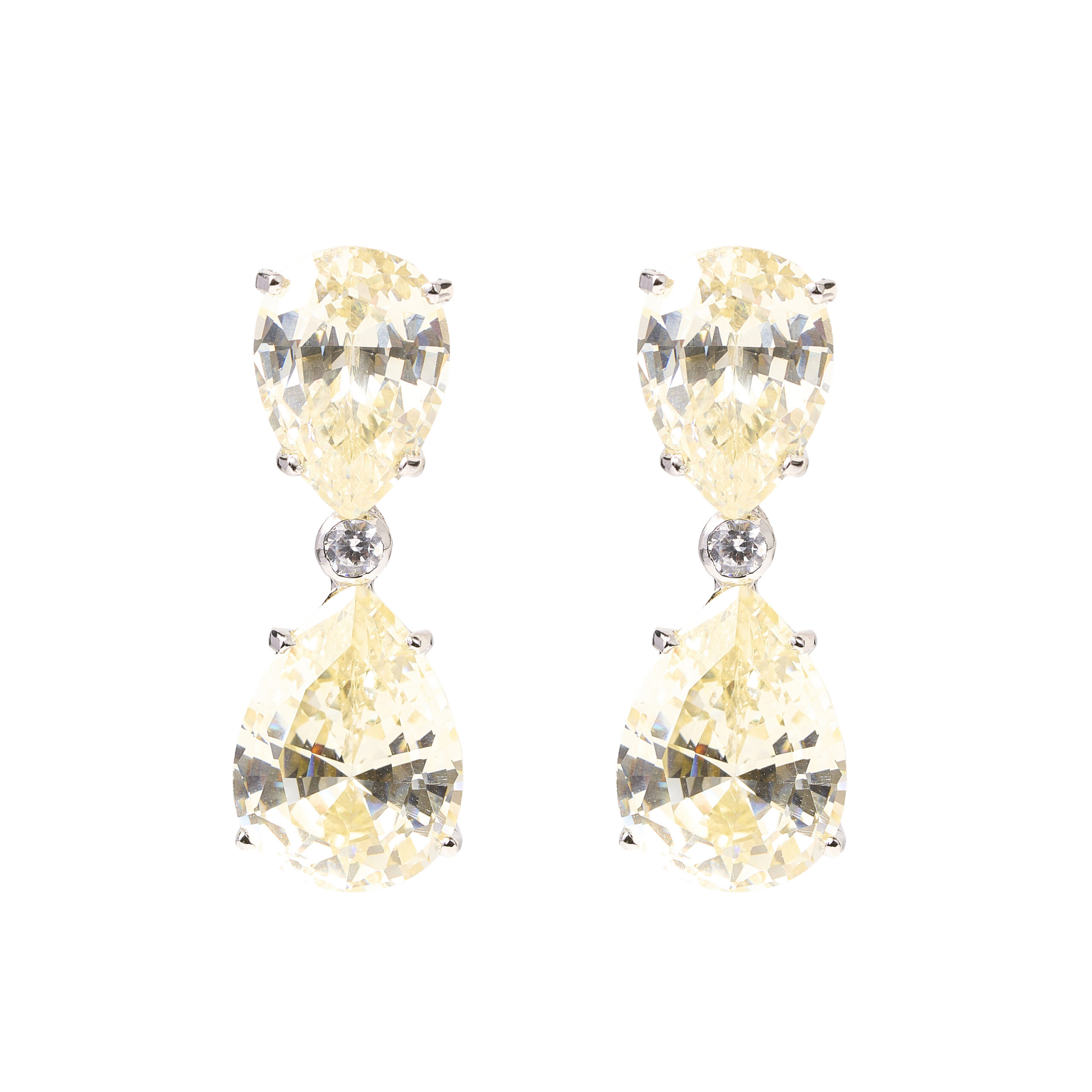 Aros de plata esterlina con dos circones en forma de gota facetas tono amarillo Canary con una circonita cubica blanca y cierre omega.