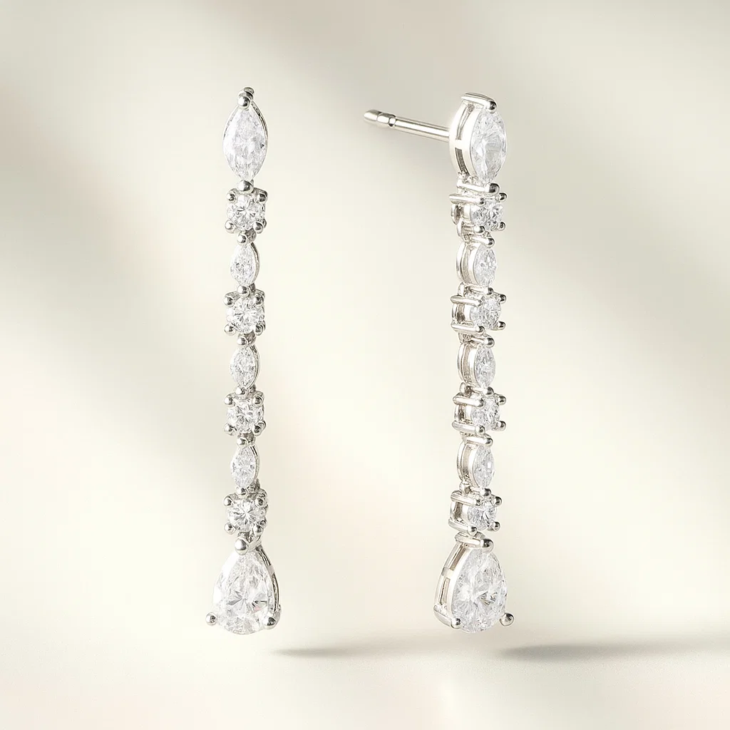 Aros de plata esterlina con diseño de aros largos de circonita cubica blanca redonda y gota, engastadas en grifa. cierre a presión.