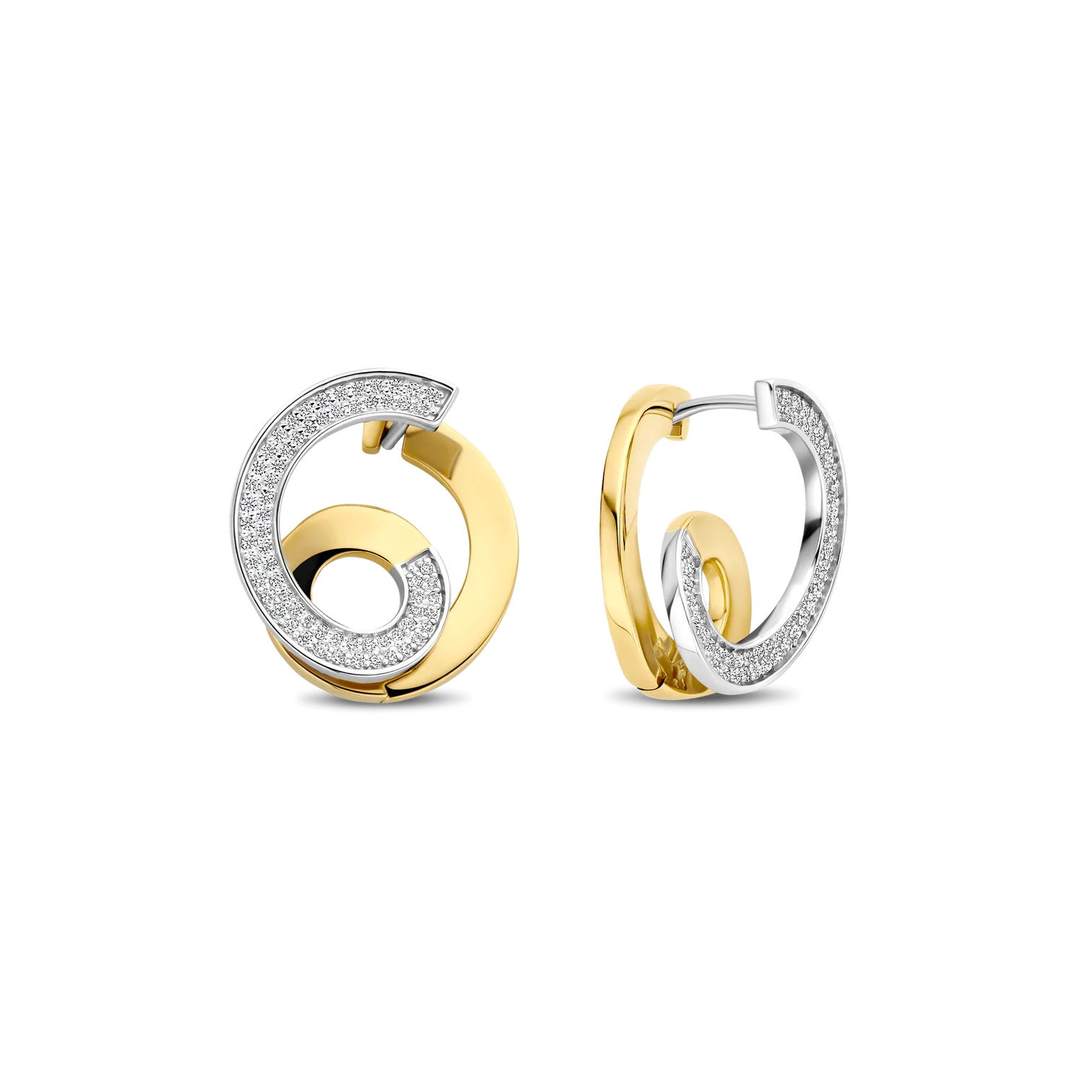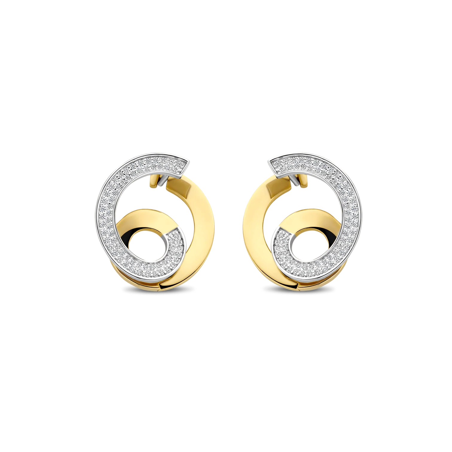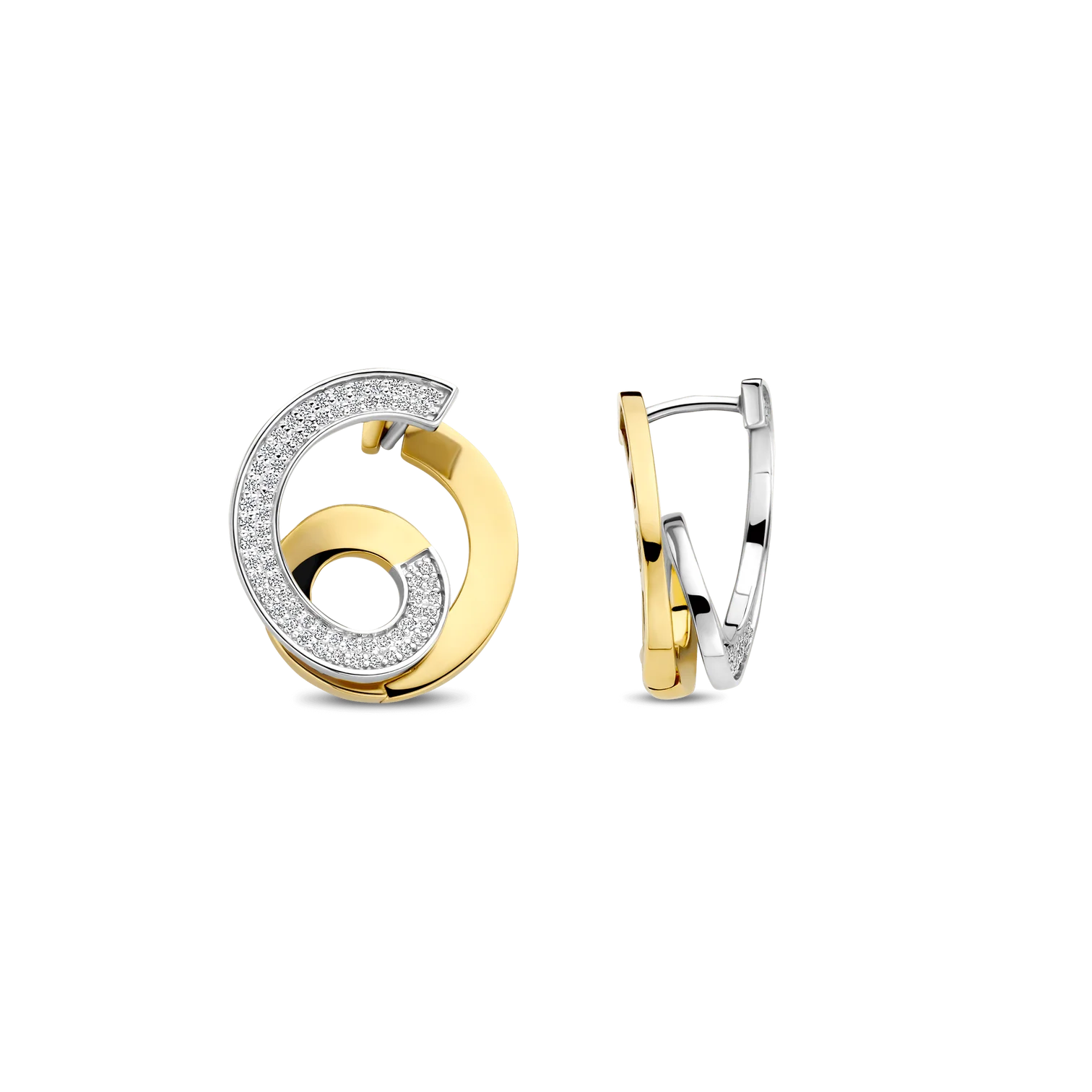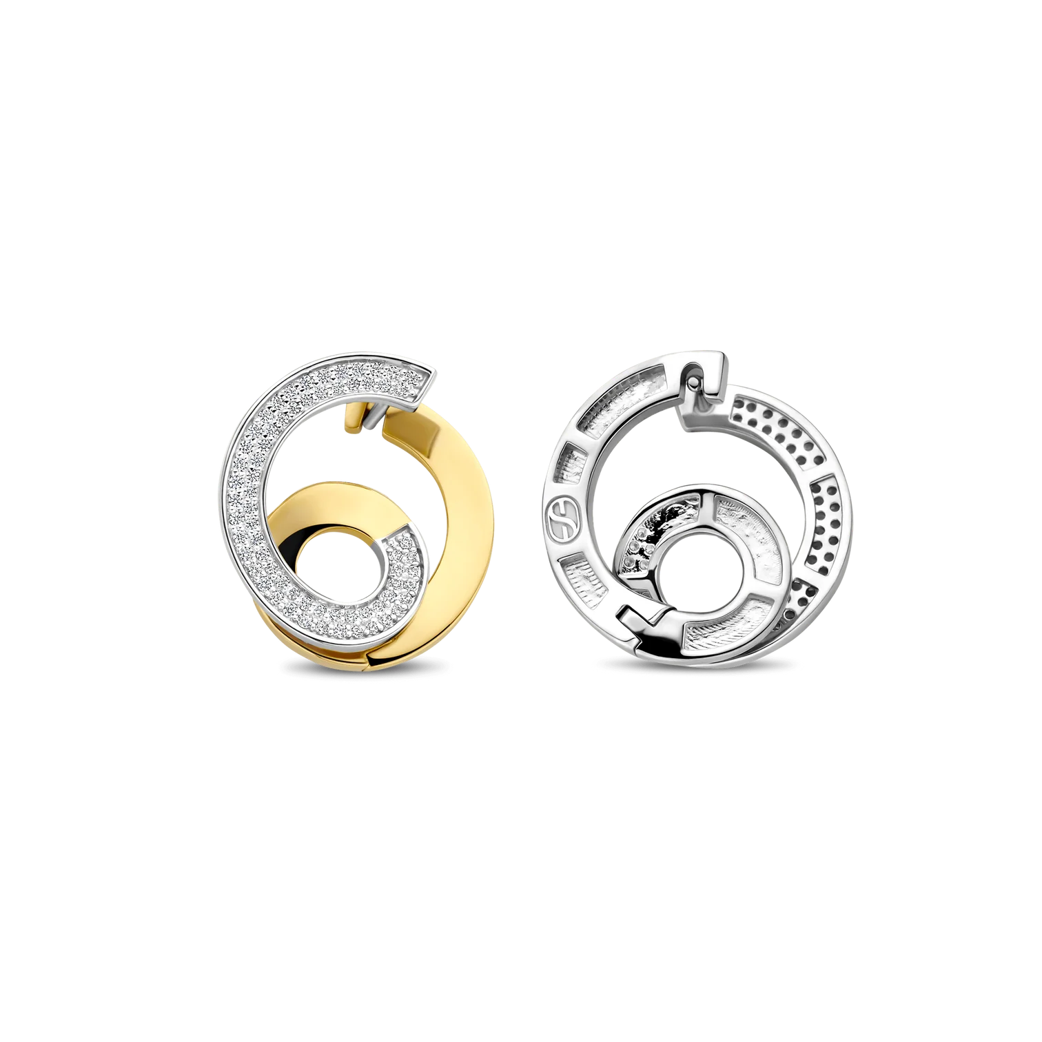 Aros ti sento modelo 78040zy de plata esterlina con recubrimiento en oro amarillo 18k con circonita cubica diseño de espiral. Largo 18,5mm
