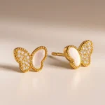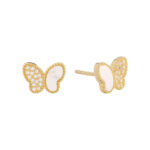 Aros de plata esterlina con recubrimiento en oro amarillo 18k en forma de mariposa con circones blancos y nácar. Tamaño 10mm