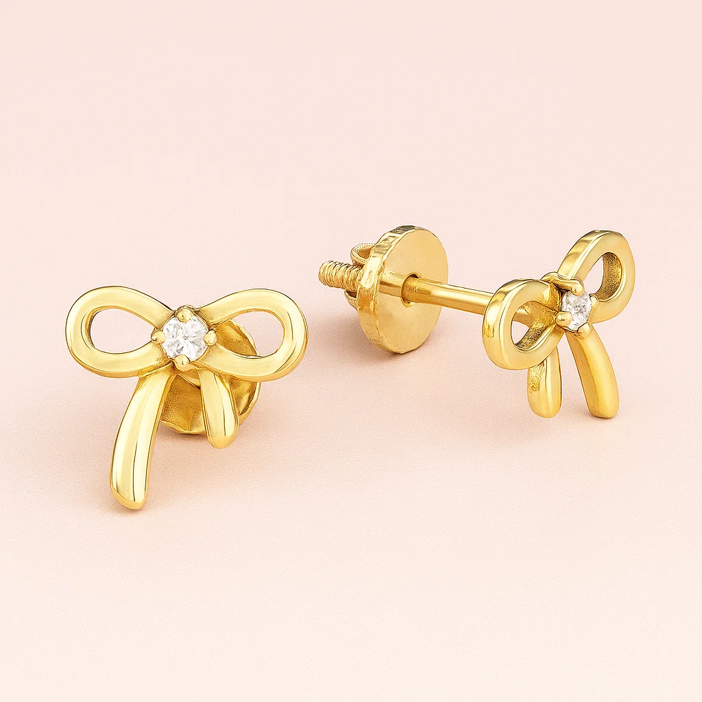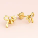 Aros de plata esterlina con recubrimiento en oro amarillo 18k, con diseño de Mini Lazo con una circonita cubica con cierre a presión. Tamaño 10mm.