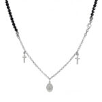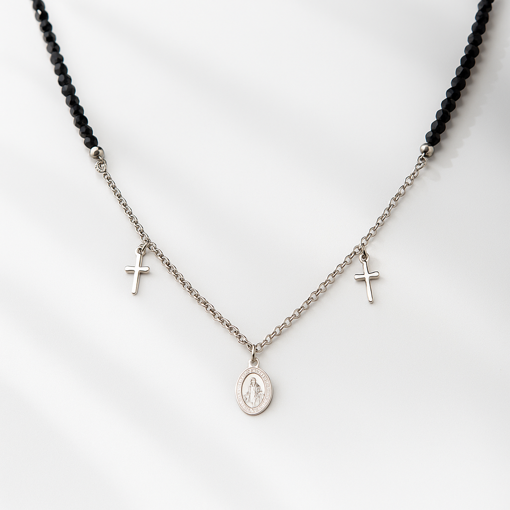 Collar religioso de plata 925 con medalla de la virgen y dos cruces, posee bolitas de ónix. Largo 45 cm.