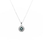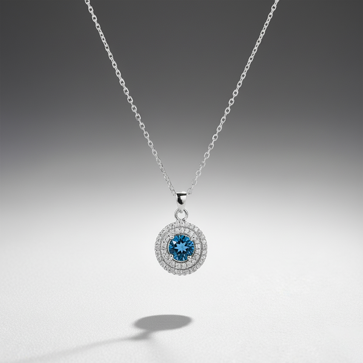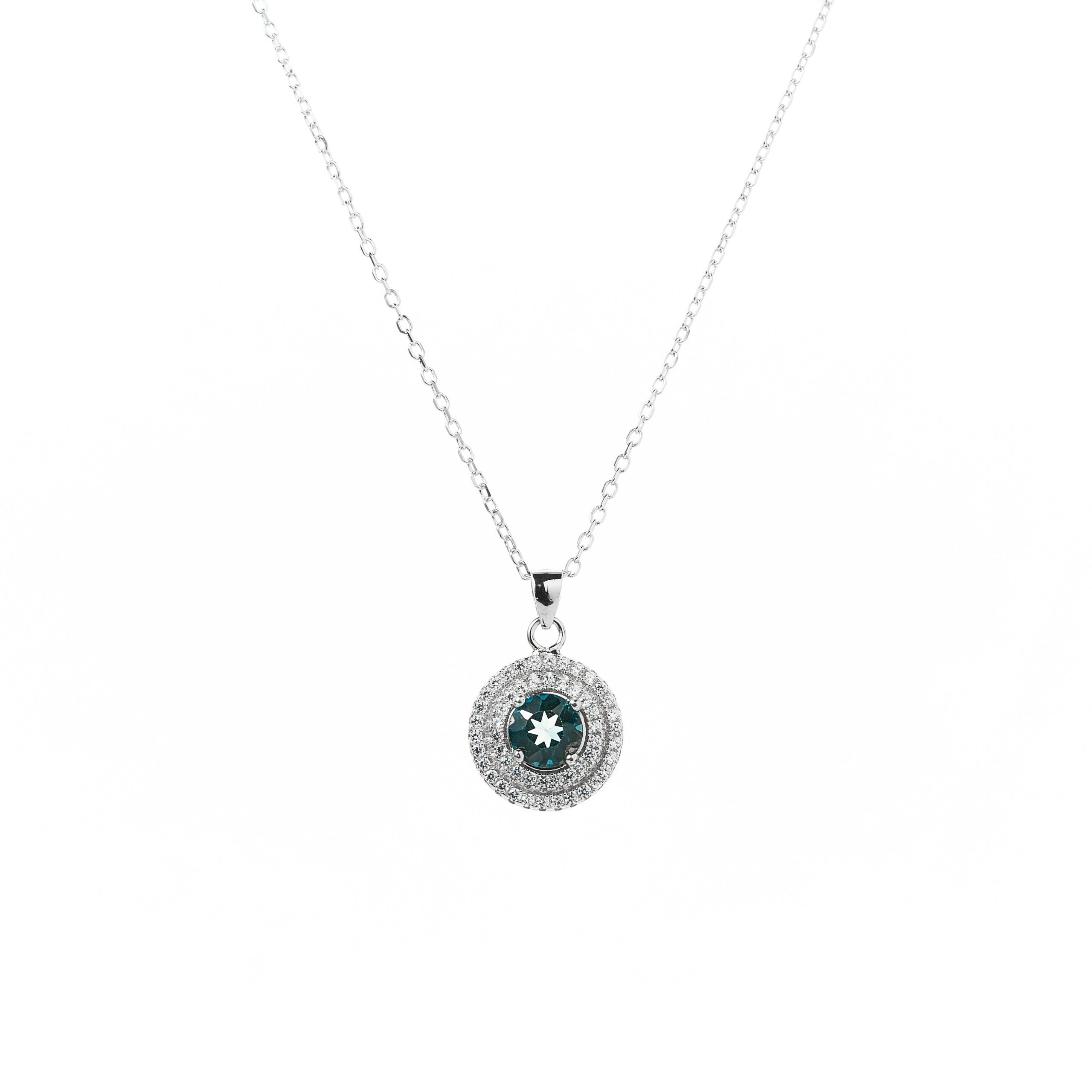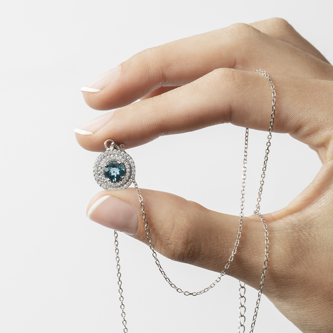 Collar blue topaz natural con doble halo de circones blancos y cadena de eslabones de plata Esterlina 925. Medidas: 8mm, cadena de 45cm