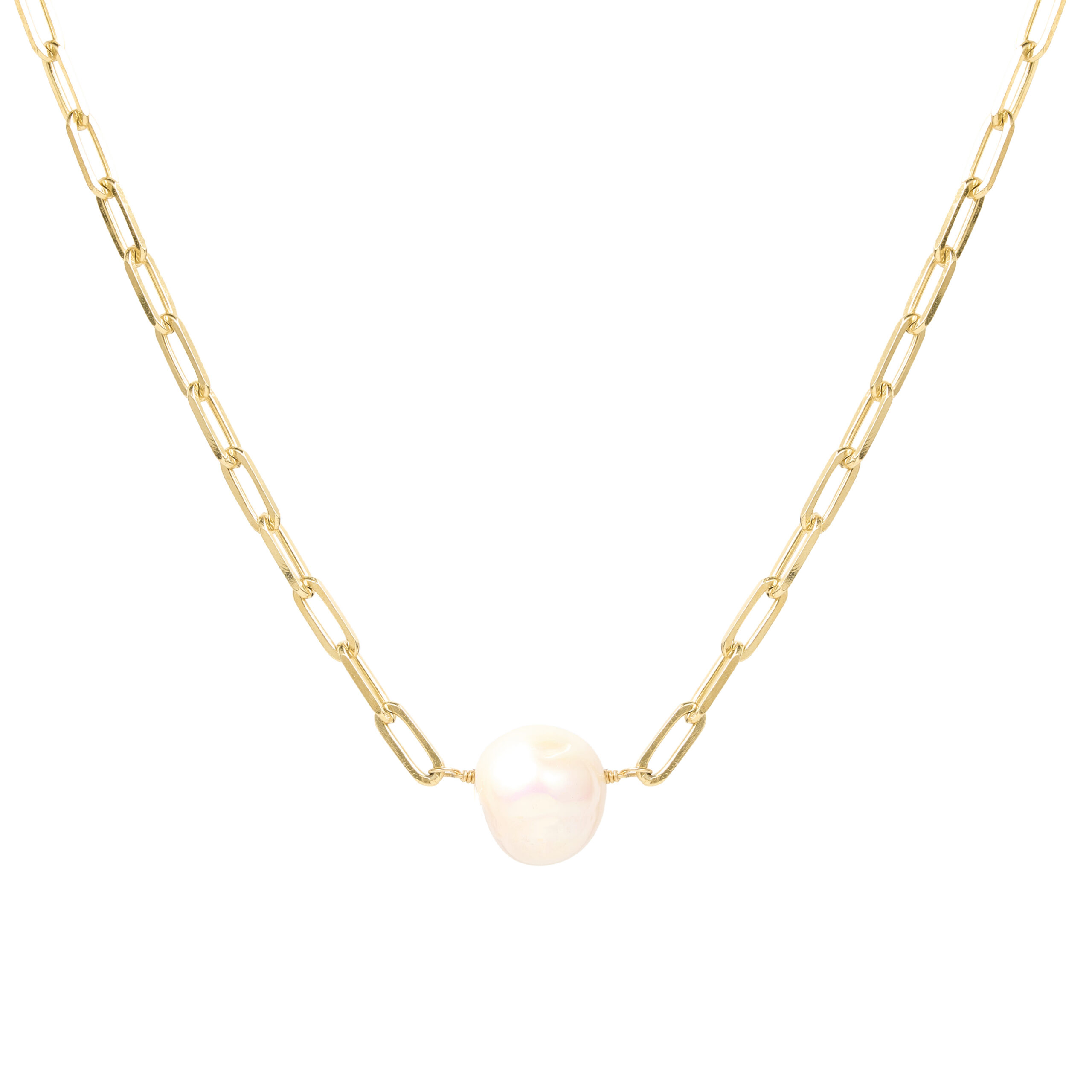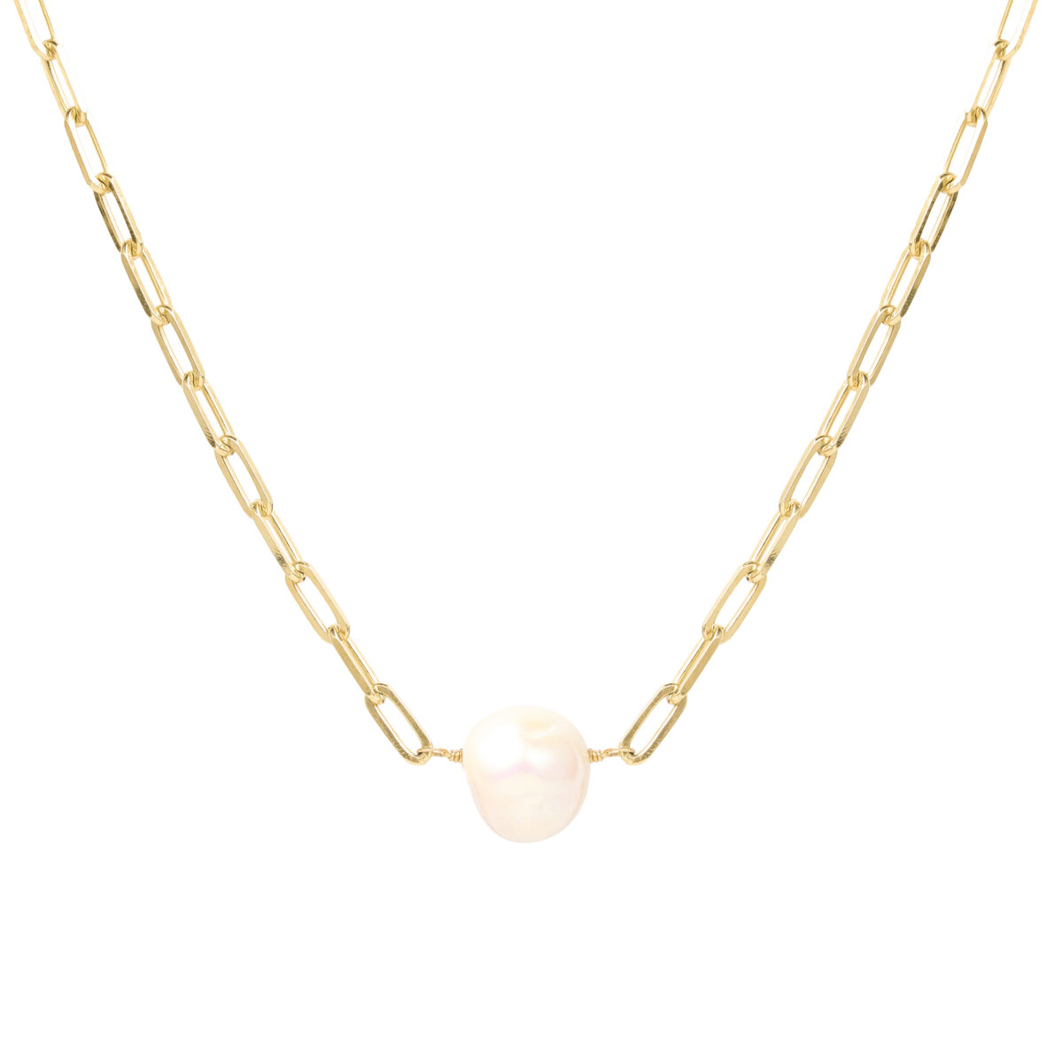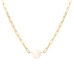 Collar de plata esterlina con recubrimiento de oro amarillo 18k con diseño de cadena de eslabones medianos pulidos paper clip y perla natural.