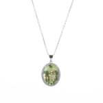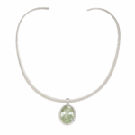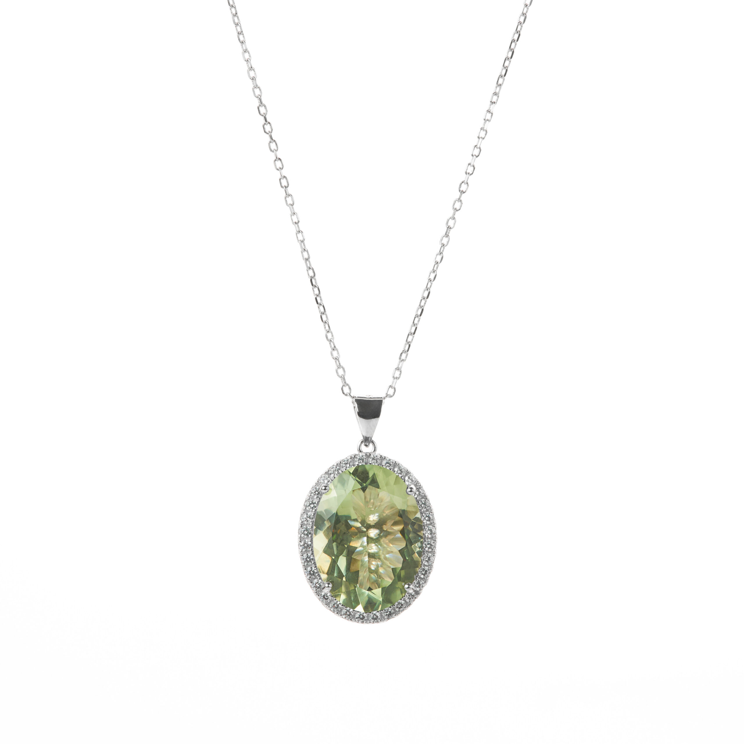 collar de amatista verde natural ovalado engastado en grifa con halo de circonita cubica blanca en Pave, con cadena de eslabones en plata.