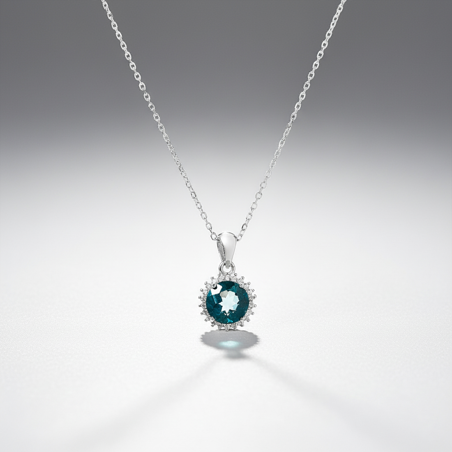 Collar de Blue topaz  natural redondo con un halo de circonita cubica blanca con cadena de eslabones de plata 925. Colgante 1,8cm x 1,2cm. Cadena de 45cm