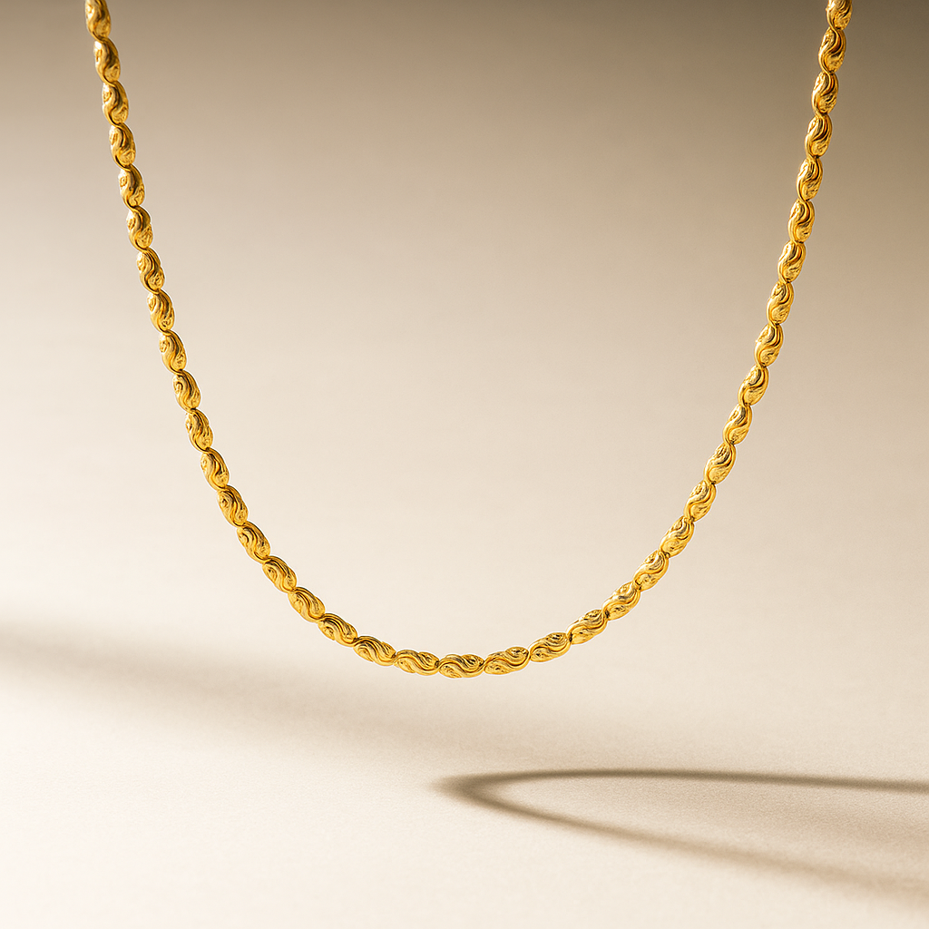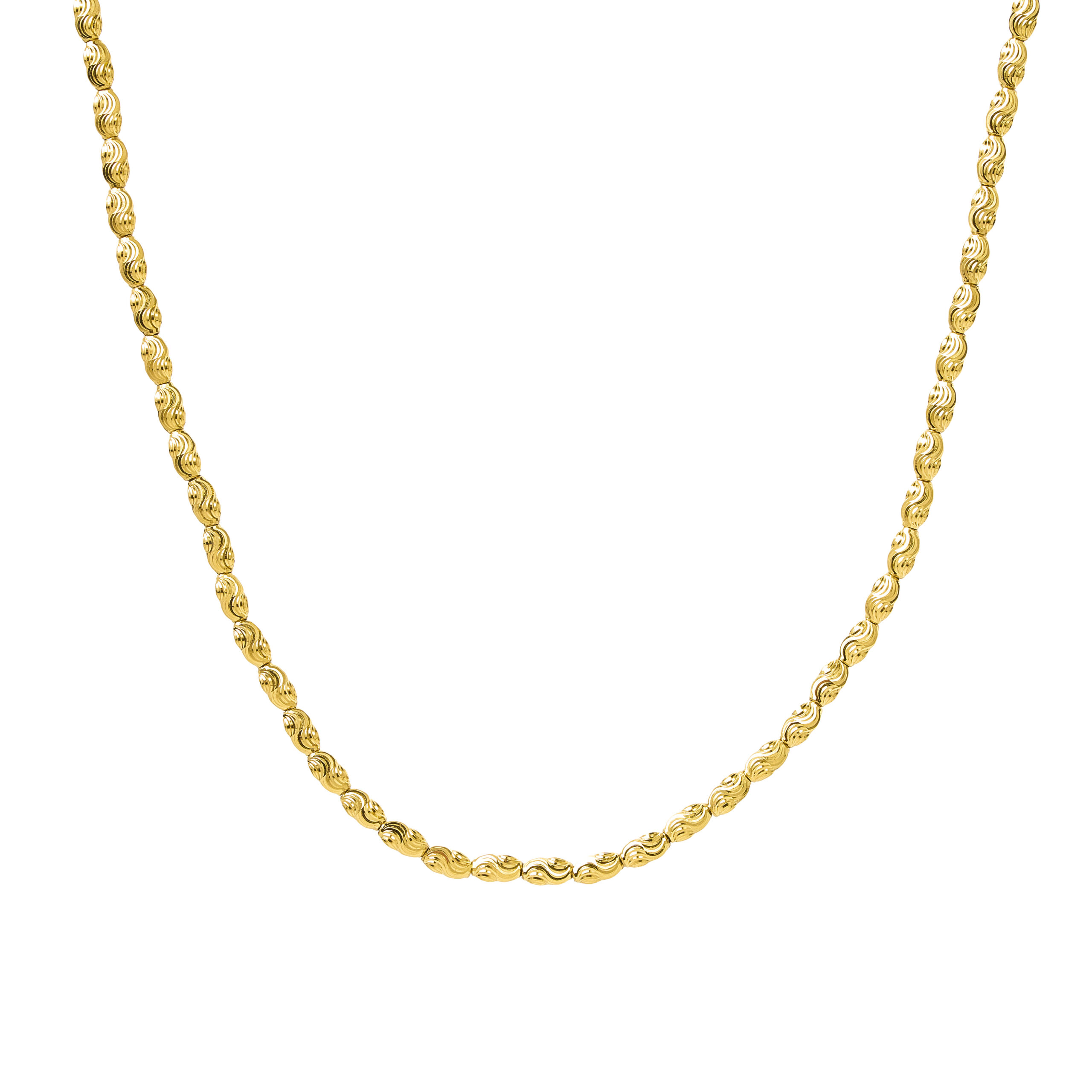 Collar de Oro Amarillo 18k con diseño de cuentas en forma de arroz  con cortes diamantados en ondas . Largo 40cm