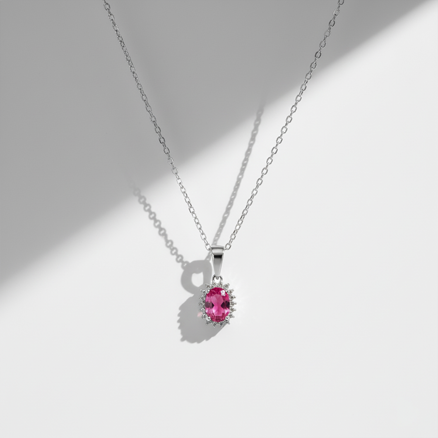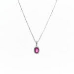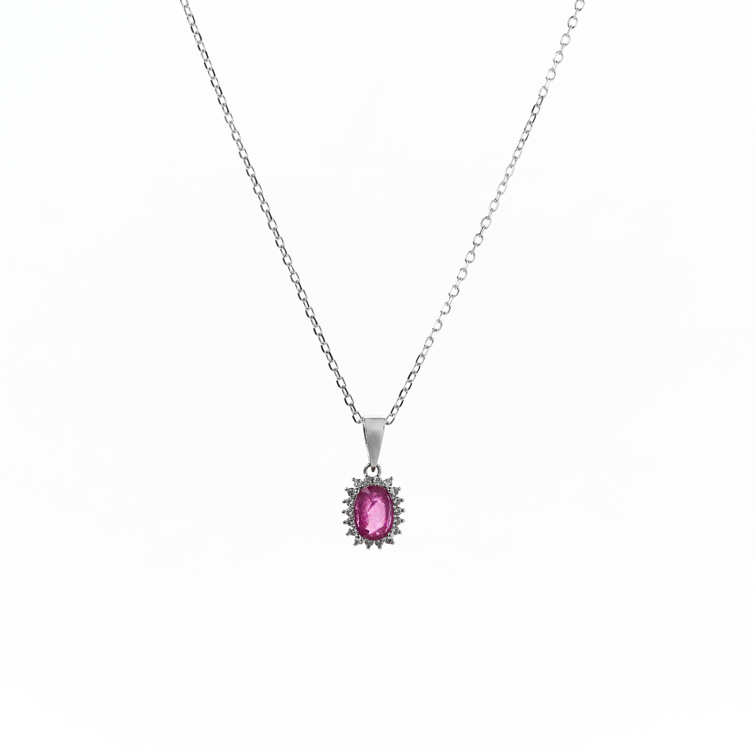 Collar de rubi natural ovalado con halo de circonitas blancas con cadena de eslabones de plata esterlina 925. Medidas: 1,5cm x 0,7cm cadena de 45cm