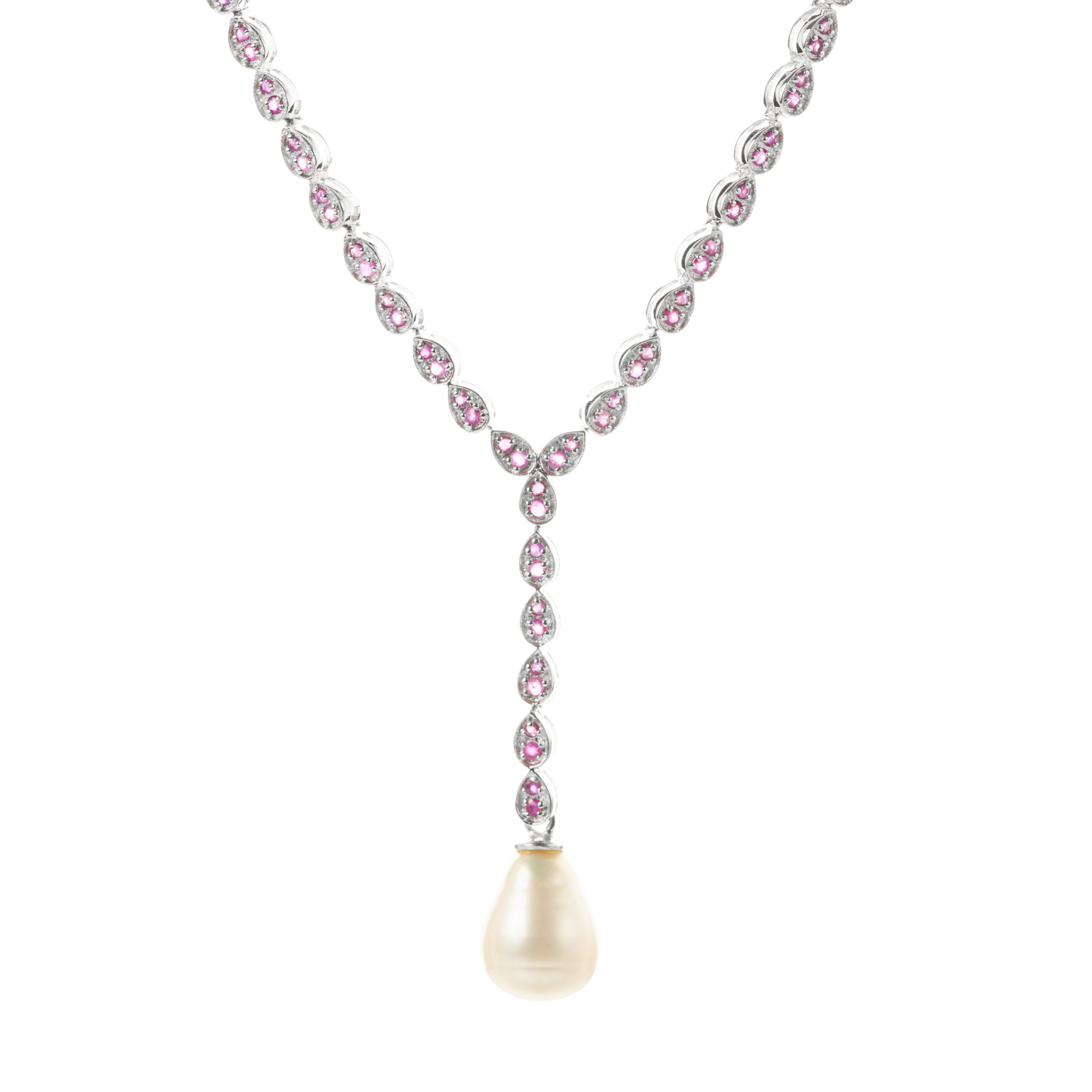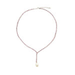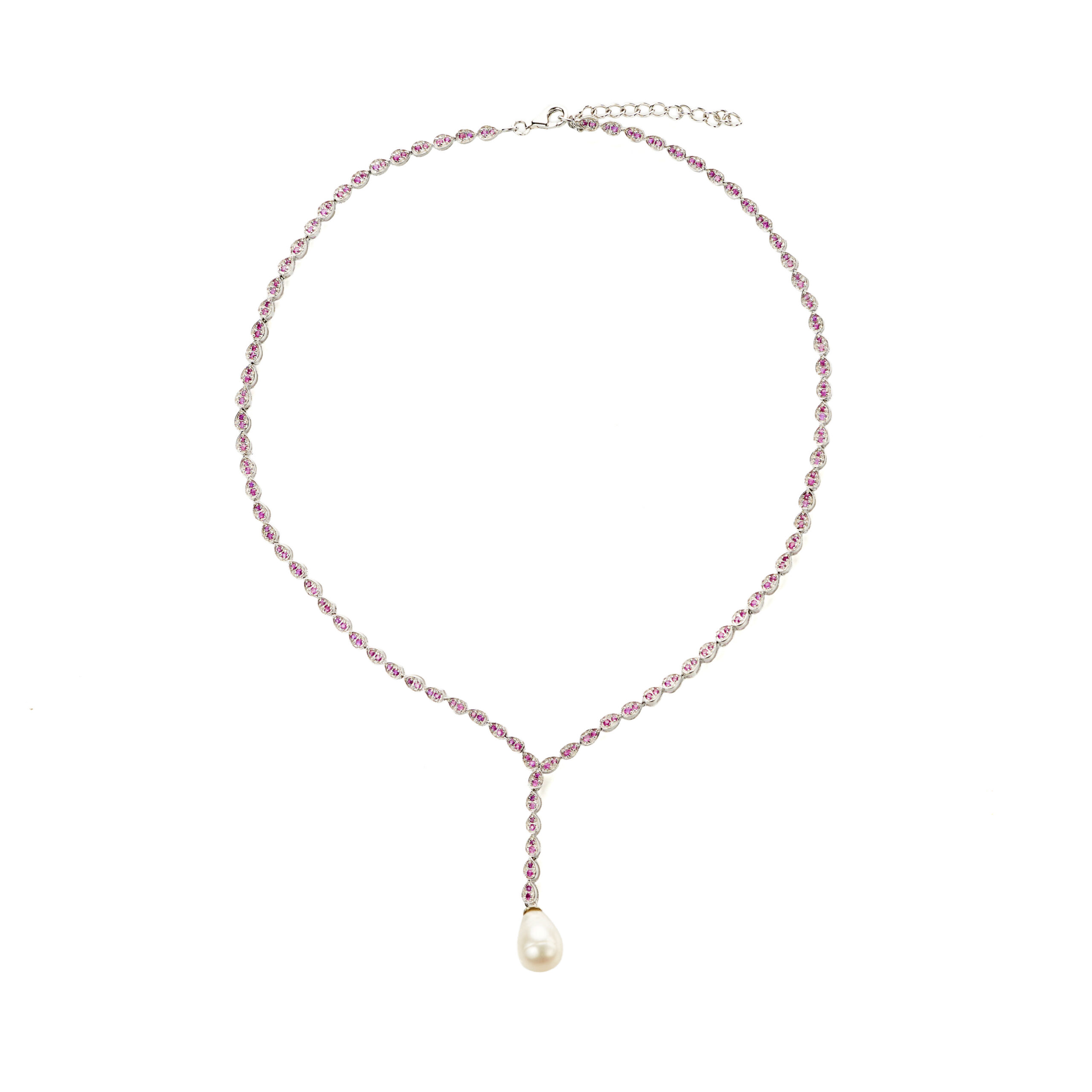 Collar de Rubies naturales engastado en pave en plata esterlina  925 con una perla en forma de gota. Largo 50 centimetros.