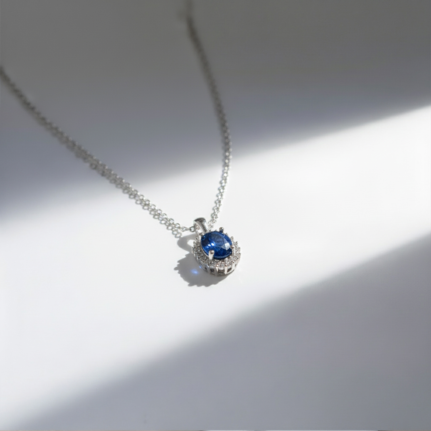 Collar de zafiro  natural redondo con un halo de circonita cubica blanca con cadena de eslabones de plata 925.  medidas 2cm x 1cm cadena de 45cm