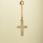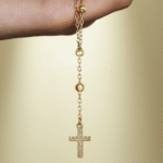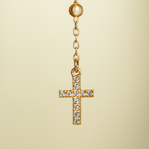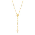 Collar de plata esterlina con recubrimiento en oro amarillo 18k con circonita cubica engastada en bisel con diseño de rosario con cruz con circones en pave.