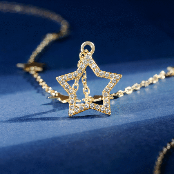 Collar multi estrellas de la colección We are all stars By Mery-Satt en plata 925 y vermeil oro amarillo 18 kilates. Mide 40 cm de largo y tiene cadena de alargue de 5 cm. En total 45 cm.