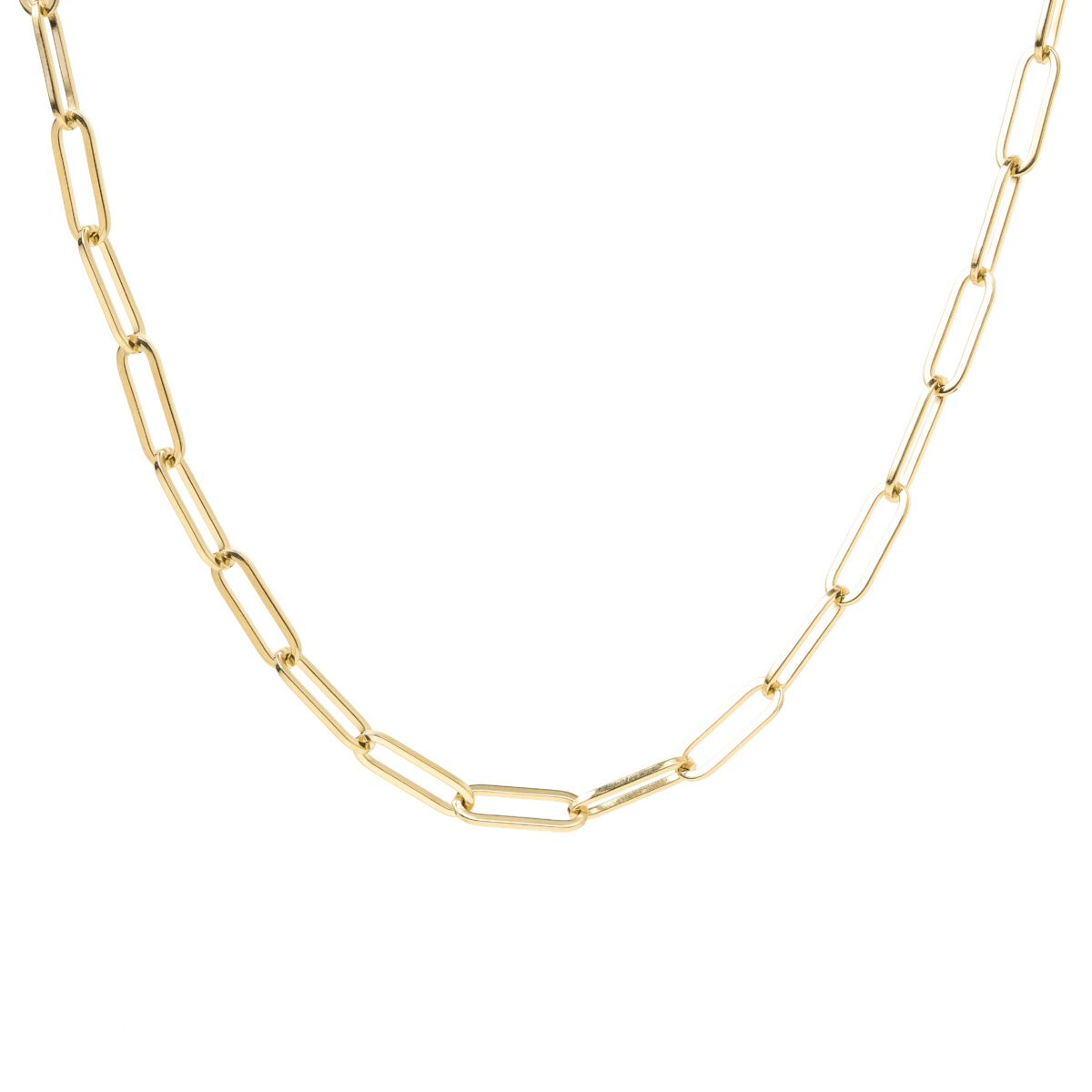 Collar de Oro Amarillo 18k con diseño de eslabones estilo paper clip alargados y pulidos. Largo 40 centimetros de largo. Peso: 14.6gramos