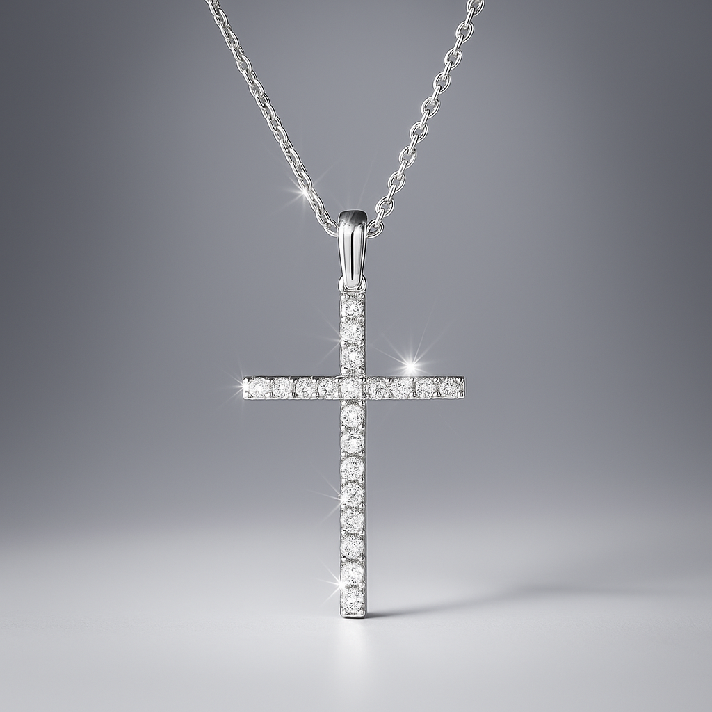 Collar de Oro blanco 18k con cadena de eslabones delgada y un colgante de cruz delgada con diamantes corte brillante engastados en pave. 0.21ct