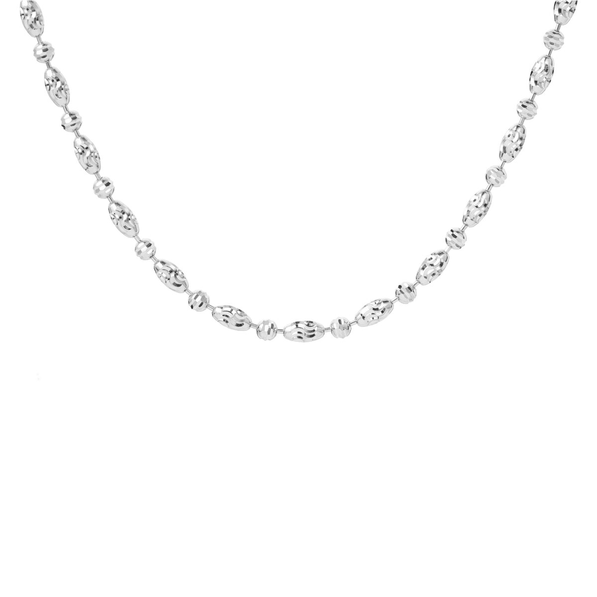 Collar de Oro blanco 18k con bolitas redondas y ovaladas de oro diamantadas con cortes para que se vea brillante, largo 40cm