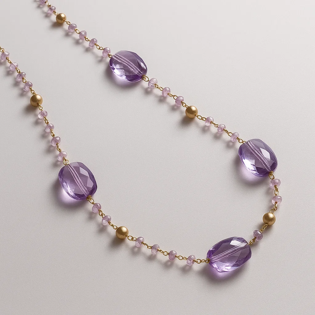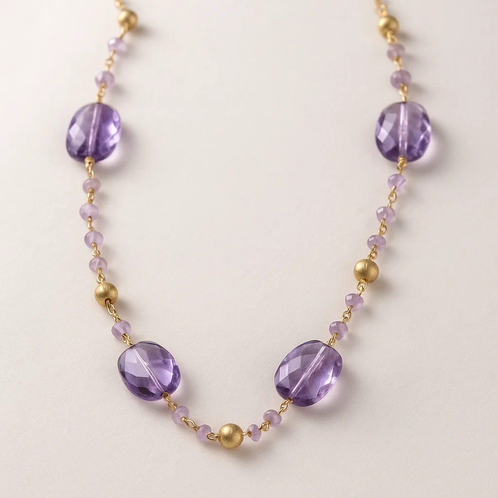 Collar de Plata esterlina 925 con recubrimiento en oro amarillo 18k con amatistas reconstituidas fachadas engastadas y bolitas doradas satinadas. Largo 60cm