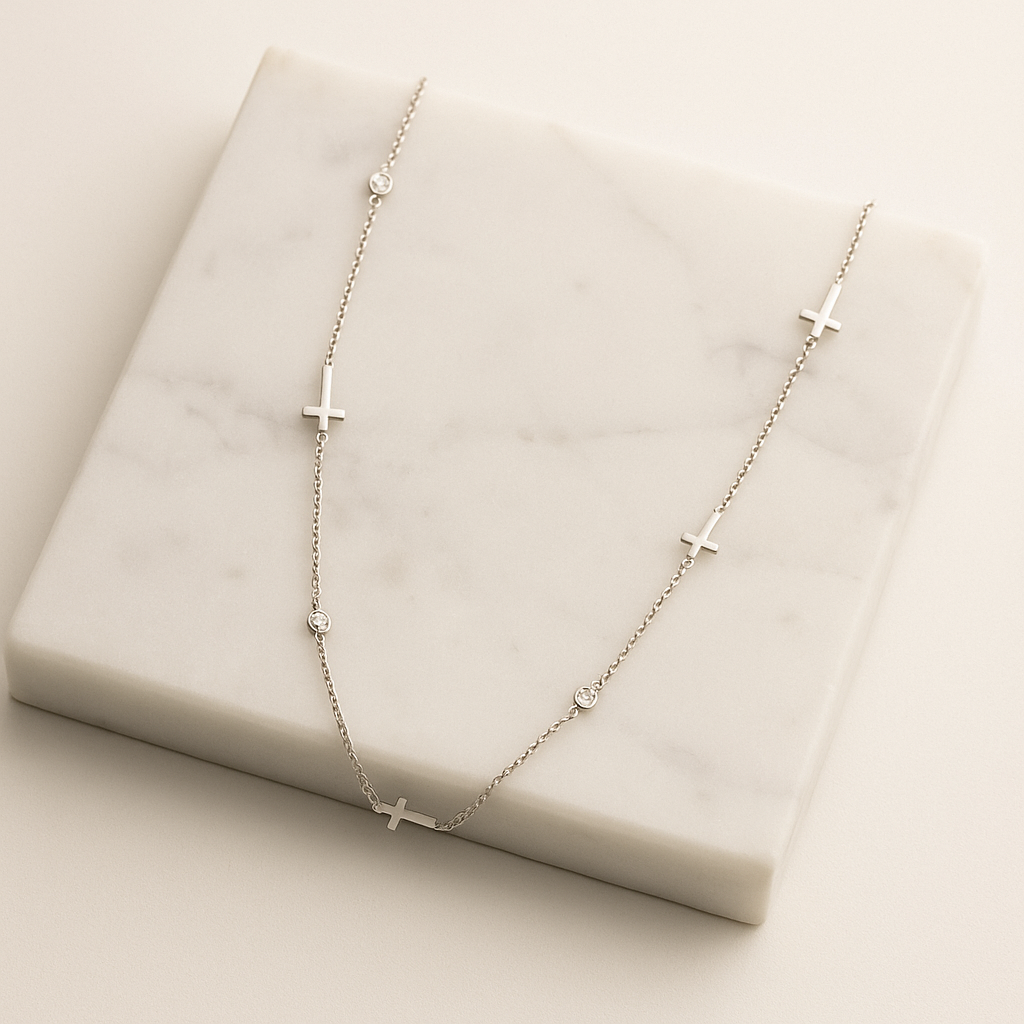Collar de plata esterlina con diseño de circonita cubica blanca engastada en bisel y cruces de plata con cadena de eslabones. 45cm