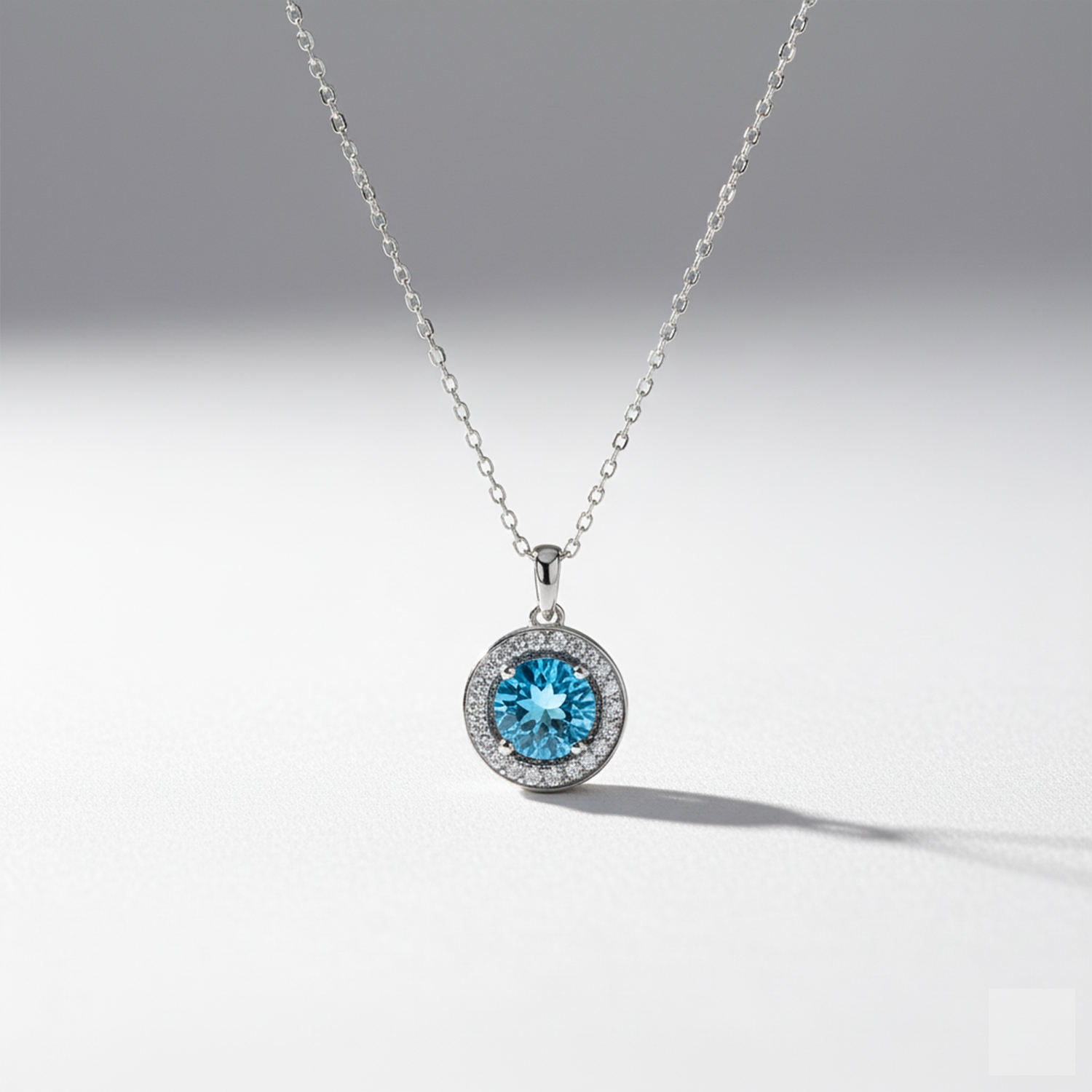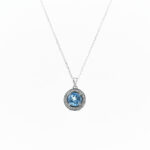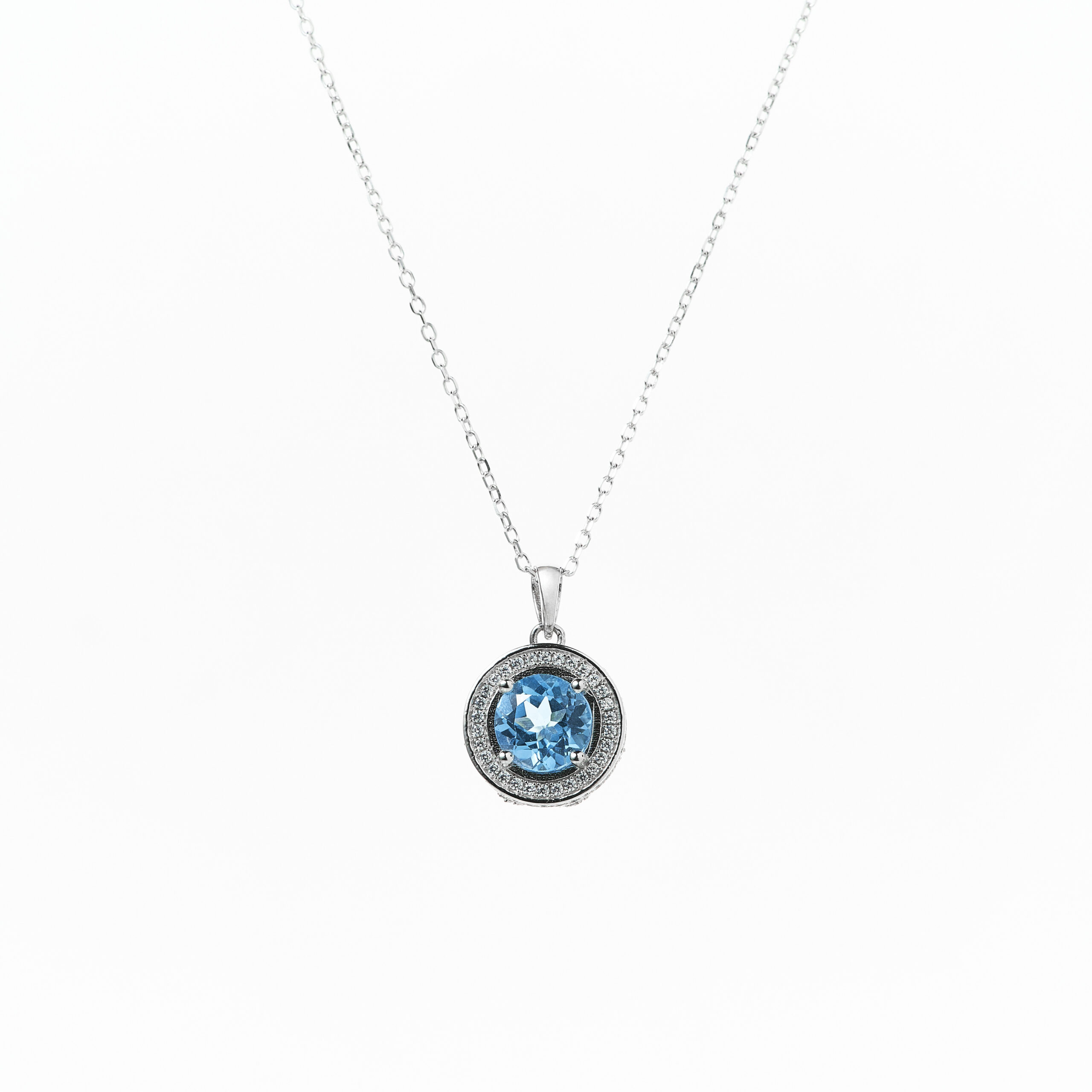 Collar topacio azul natural con halo de circonita cubica blanca y cadena de eslabones de plata 925. Medidas: 1,8cm colgante, cadena de 45cm