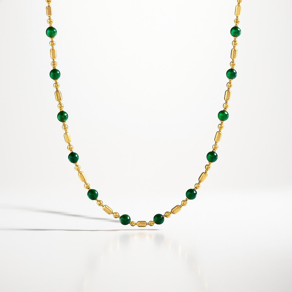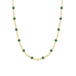 Collar de Plata esterlina con recubrimiento en oro amarillo 18k con diseño de cuentas de plata redondas y alargadas con esmalte italiano verde. Largo 45cm