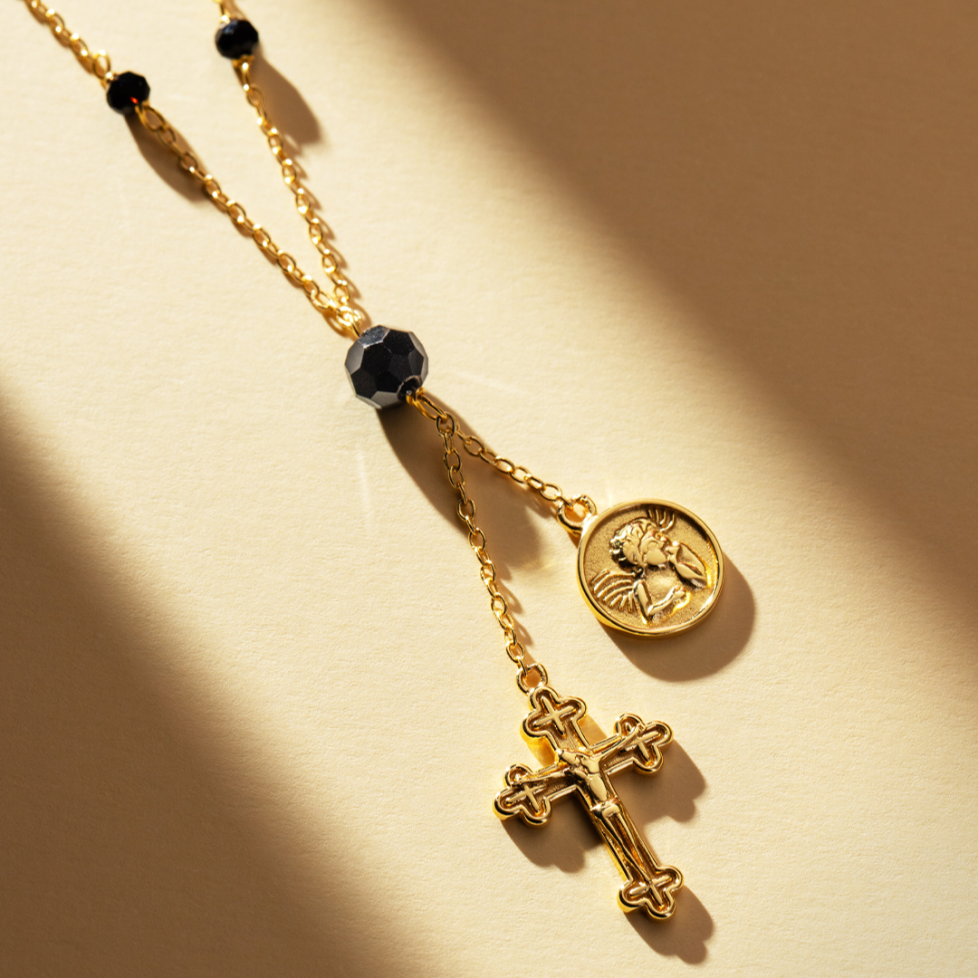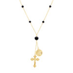 Collar de plata esterlina con recubrimiento en oro amarillo 18k con medalla y cruz y cuentas de onyx facetadas. Largo 45cm