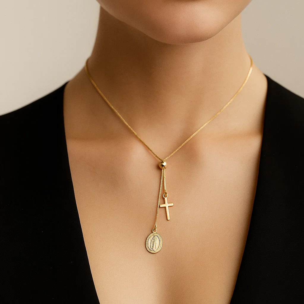 Collar de plata esterlina con recubrimiento en oro amarillo 18k con diseño de cadena de maquina con cruz medalla ajustable diseño en Y.