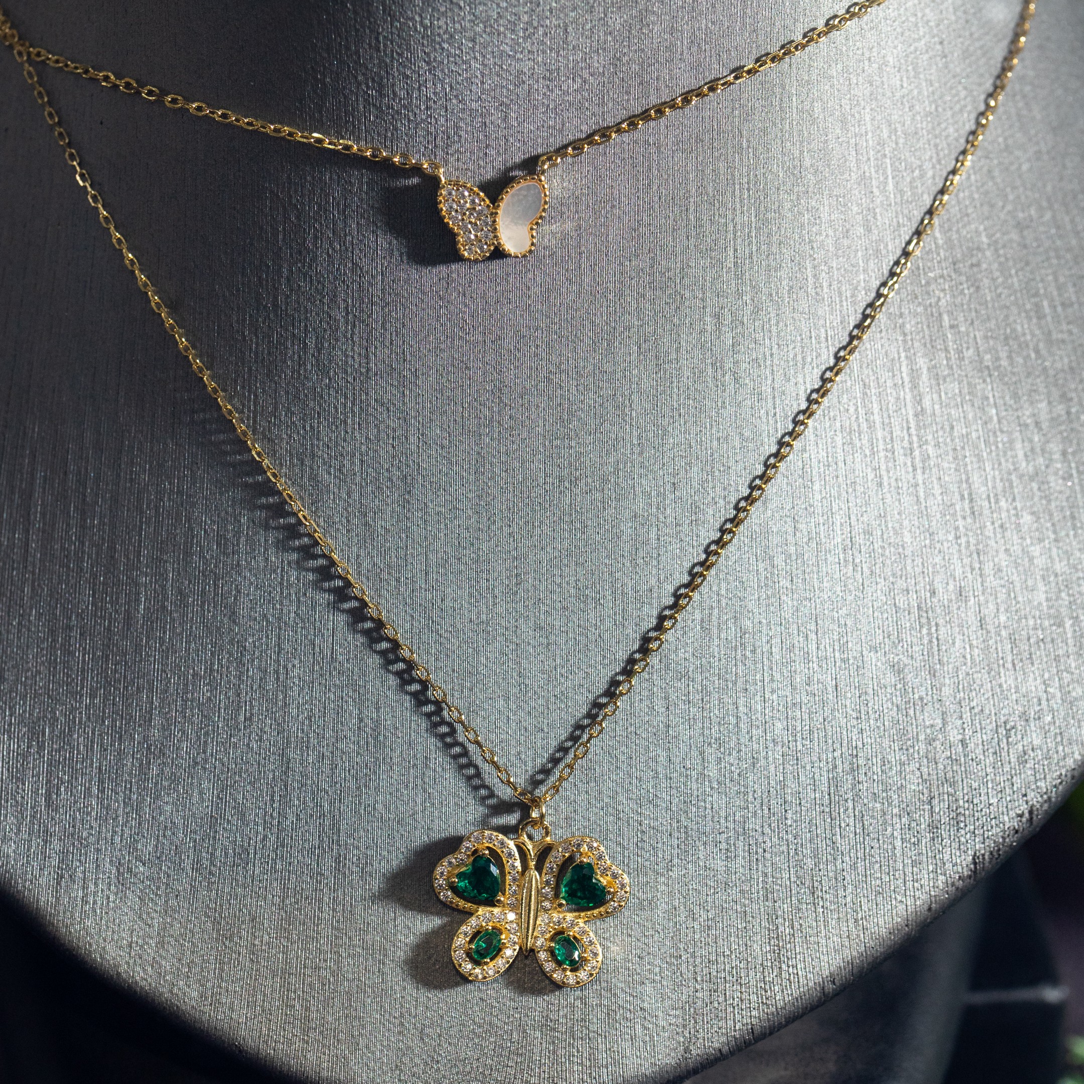 Collar de Plata esterlina con recubrimiento en oro amarillo 18k con circonita cubica blanca y verde en forma de Mariposa. Largo 45cm