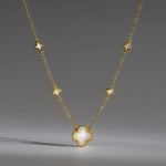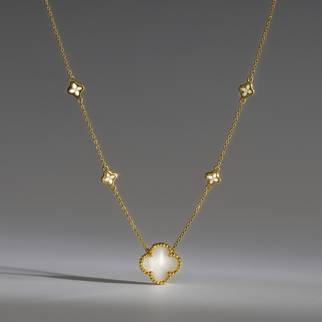Collar de plata esterlina con recubrimiento en oro amarillo con un trébol central de nácar con circonita cubica blanca de 12mm y 4 siluetas de trébol en la cadena, largo 45cm