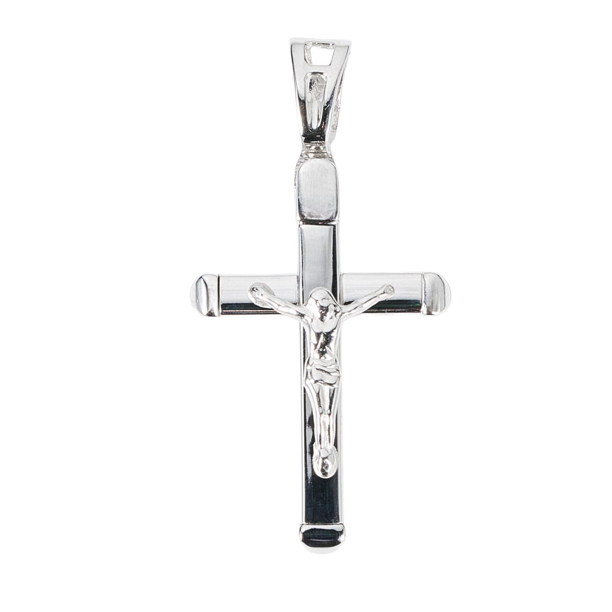 Colgante de Oro blanco 18k con diseño de crucifijo plano y pulido de 35 milimetros de largo x 15 milimetros de ancho.