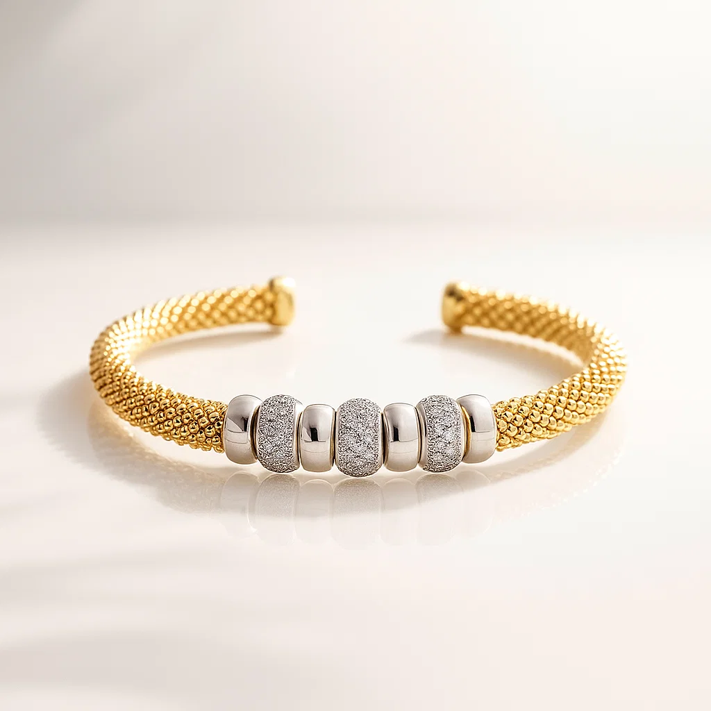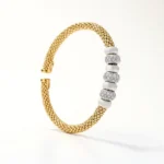 Esclava diseño fope y tubogas en plata 925 con terminación en oro amarillo 18 kilates y detalles en circonita suiza.