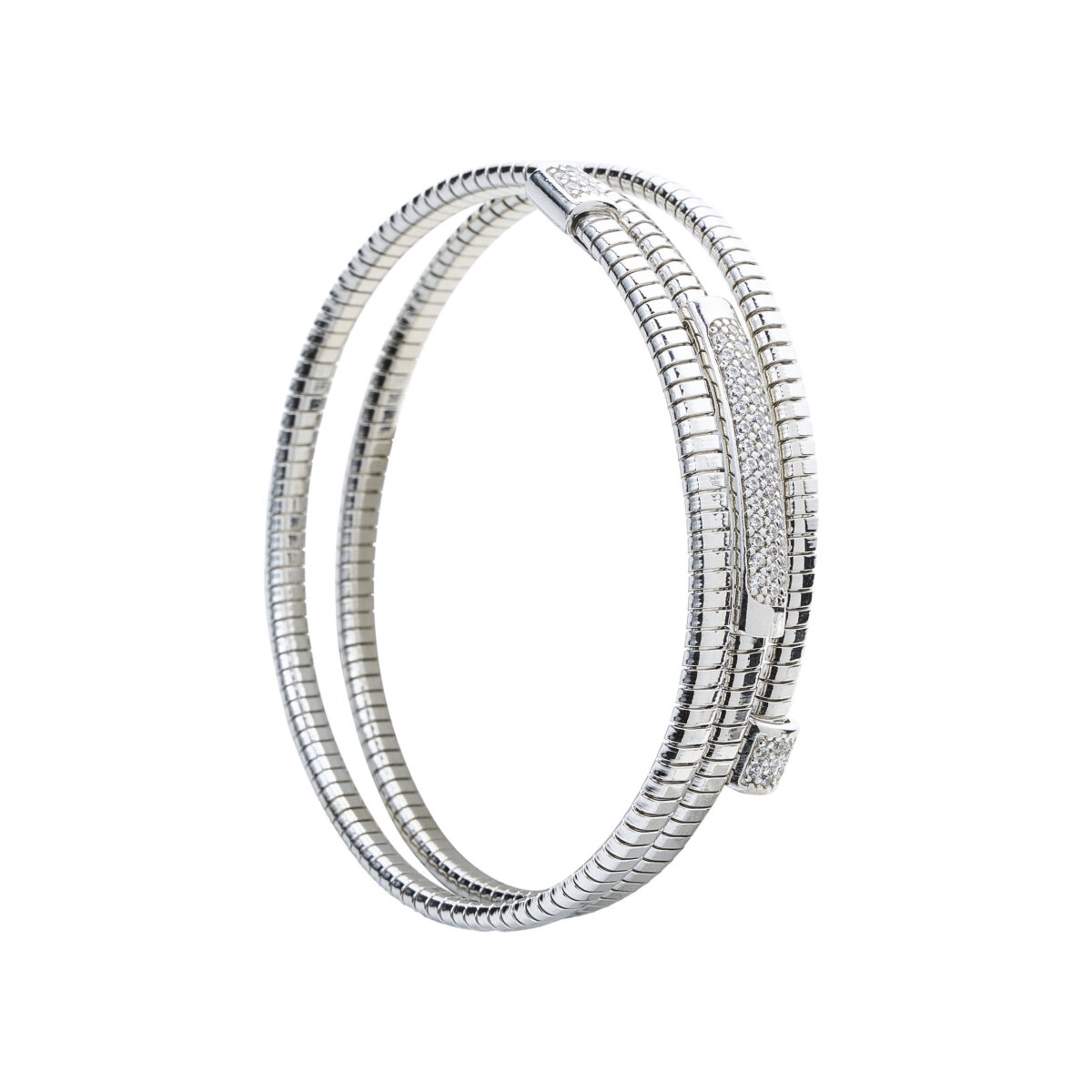 Esclava triple de la colección Essenza diseño tubogas en plata 925 y diseño frontal en pavé de circonita suiza.