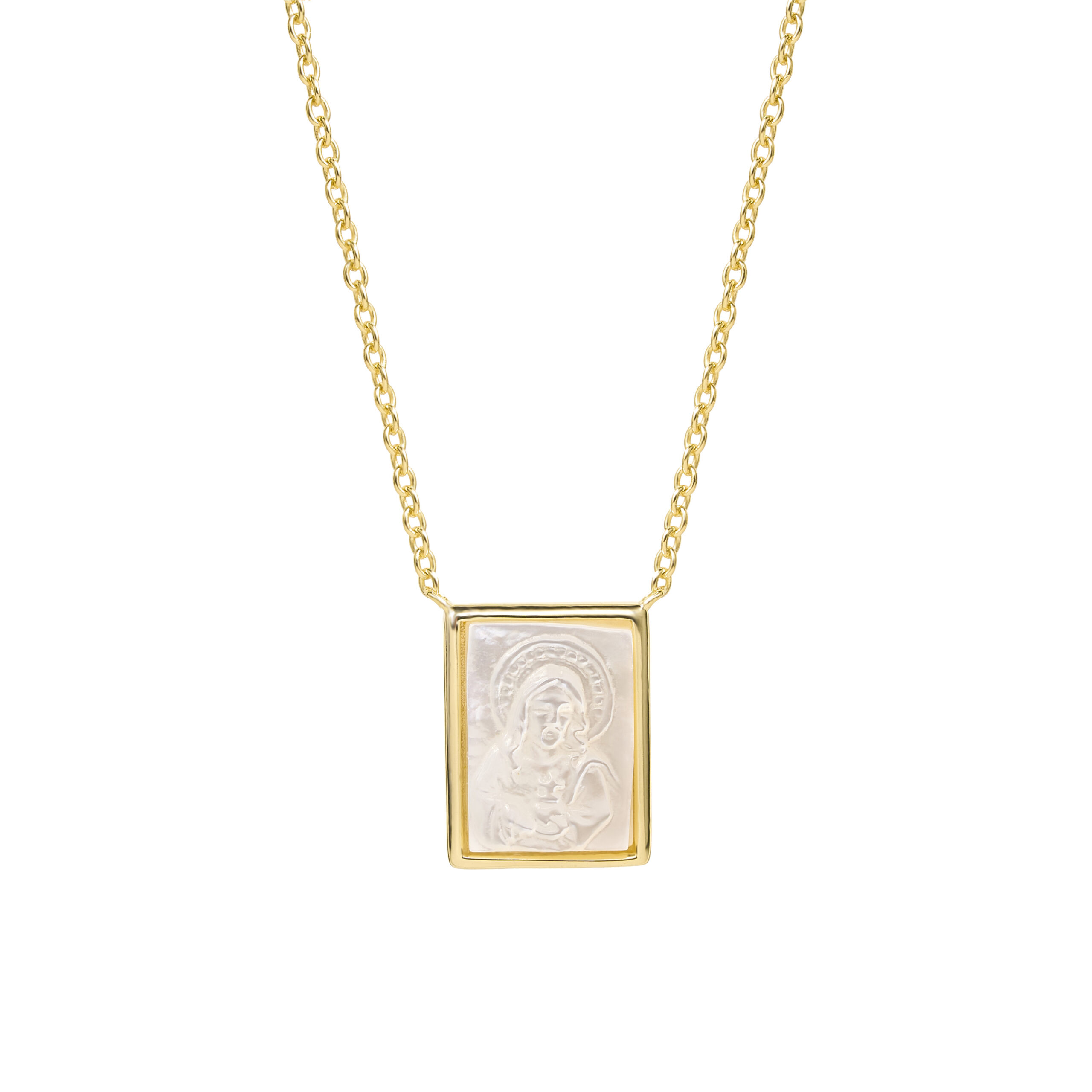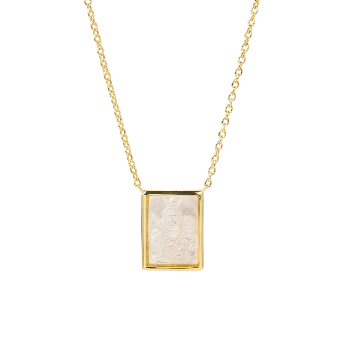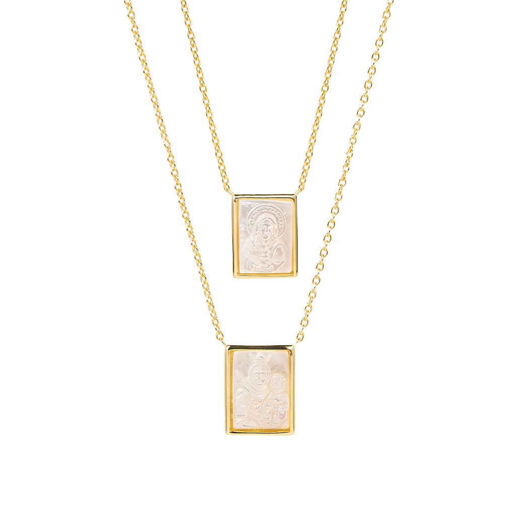 Collar de plata esterlina 925 con recubrimiento de oro amarillo 18k con diseño de escapulario doble rectangular de nácar.