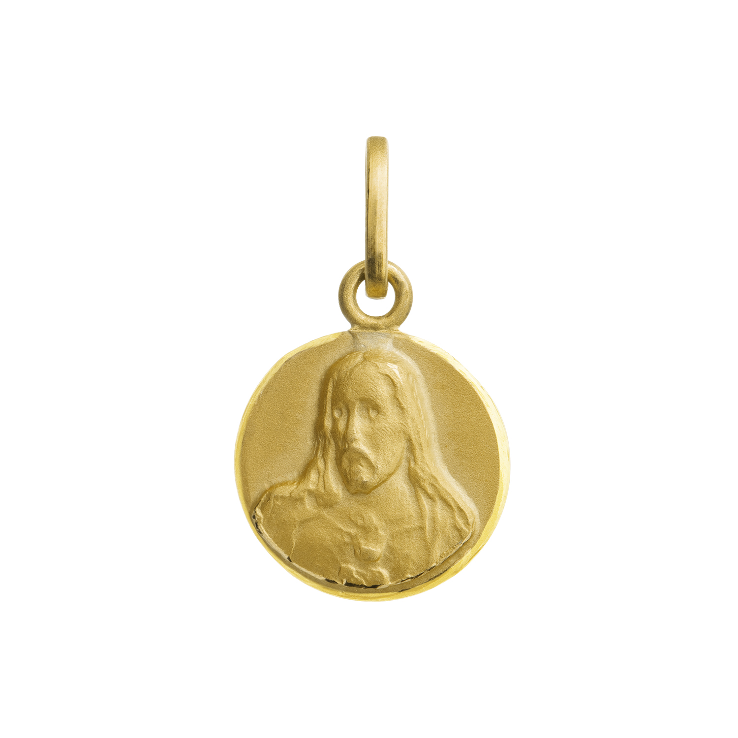 Medalla redonda de Jesús en oro amarillo de 18 kilates. Mide 12 milímetros.