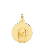 Medalla de Virgen Maria en oro amarillo 18k con un diámetro de 18 milímetros. Diseñada con acabado pulido y detalles en relieve sobre base redonda.