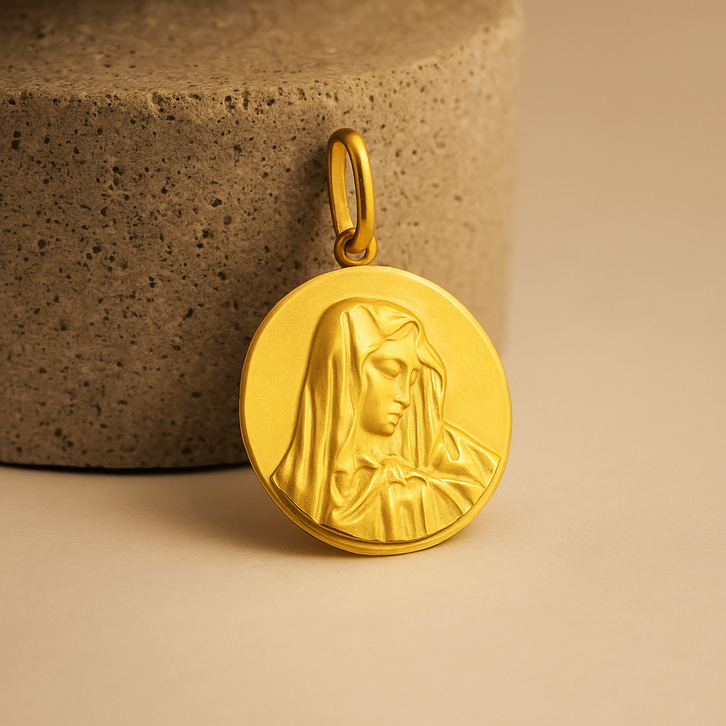 Medalla Virgen del Manto en forma redonda, diseñada en oro amarillo de 18 kilates. Mide 18 milímetros.
