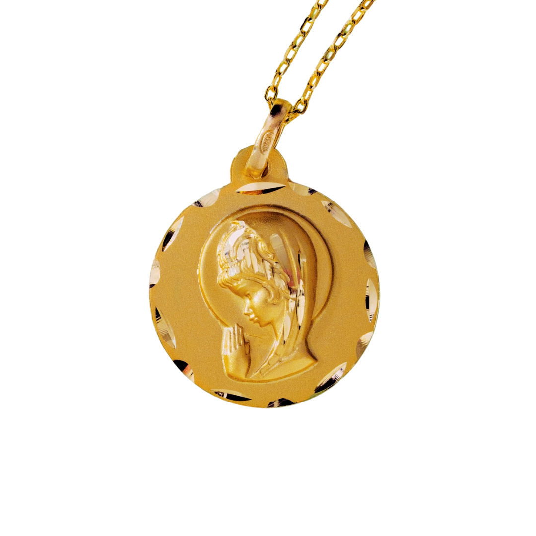 Medalla redonda de Jesús en oro amarillo de 18 kilates. Mide 12 milímetros.
