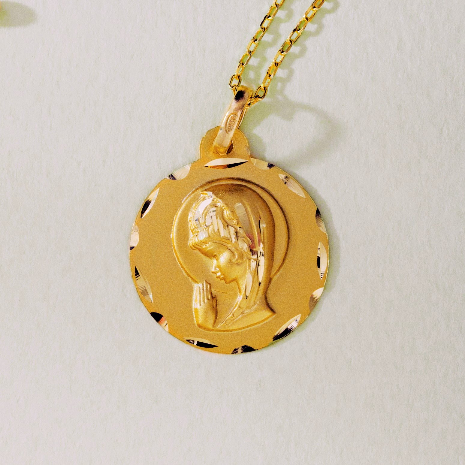 Medalla virgen niña en oro amarillo 18 kilates, tamaño 18 milímetros.