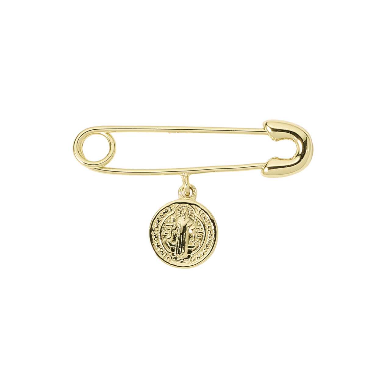 Clip de plata esterlina con recubrimiento de oro amarillo 18k de 28mm de ancho con una medalla mini de San Benito.