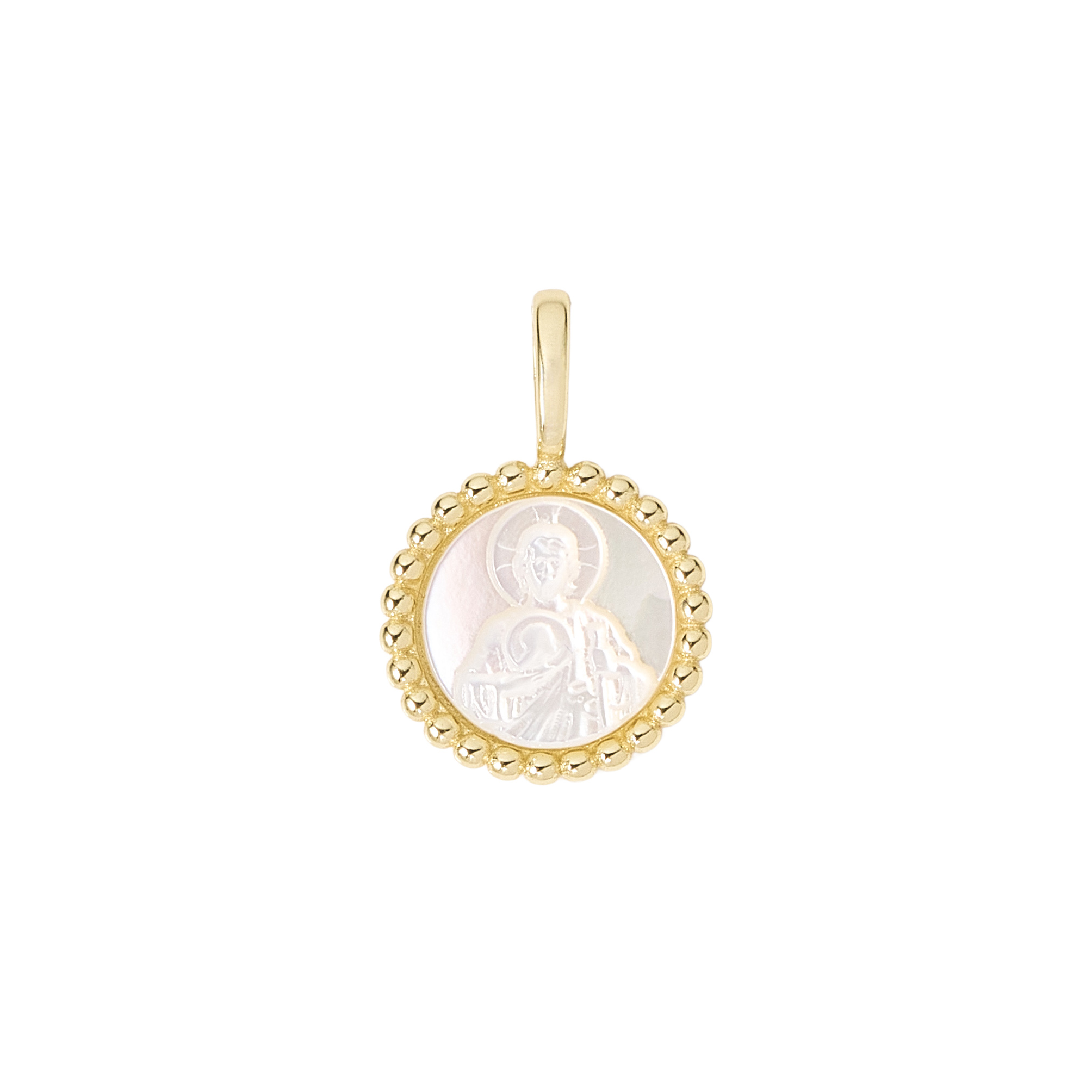Medalla de plata esterlina con recubrimiento de oro amarillo 18k, figura de san judas Tadeo en nácar. Tamaño 10mm.