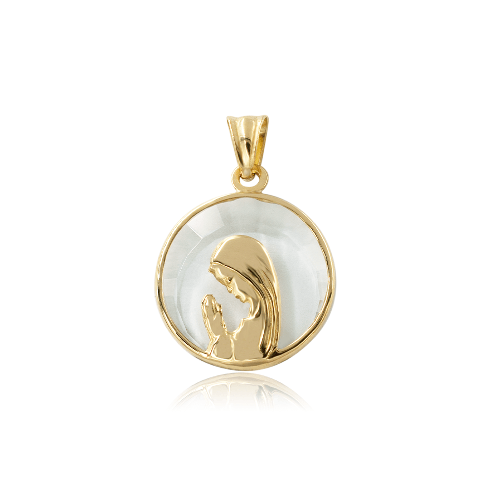 Medalla diseño redondo de oro amarillo 18 kilates con Virgen Niña sobre cristal. Mide 17 milímetros.
