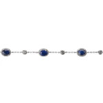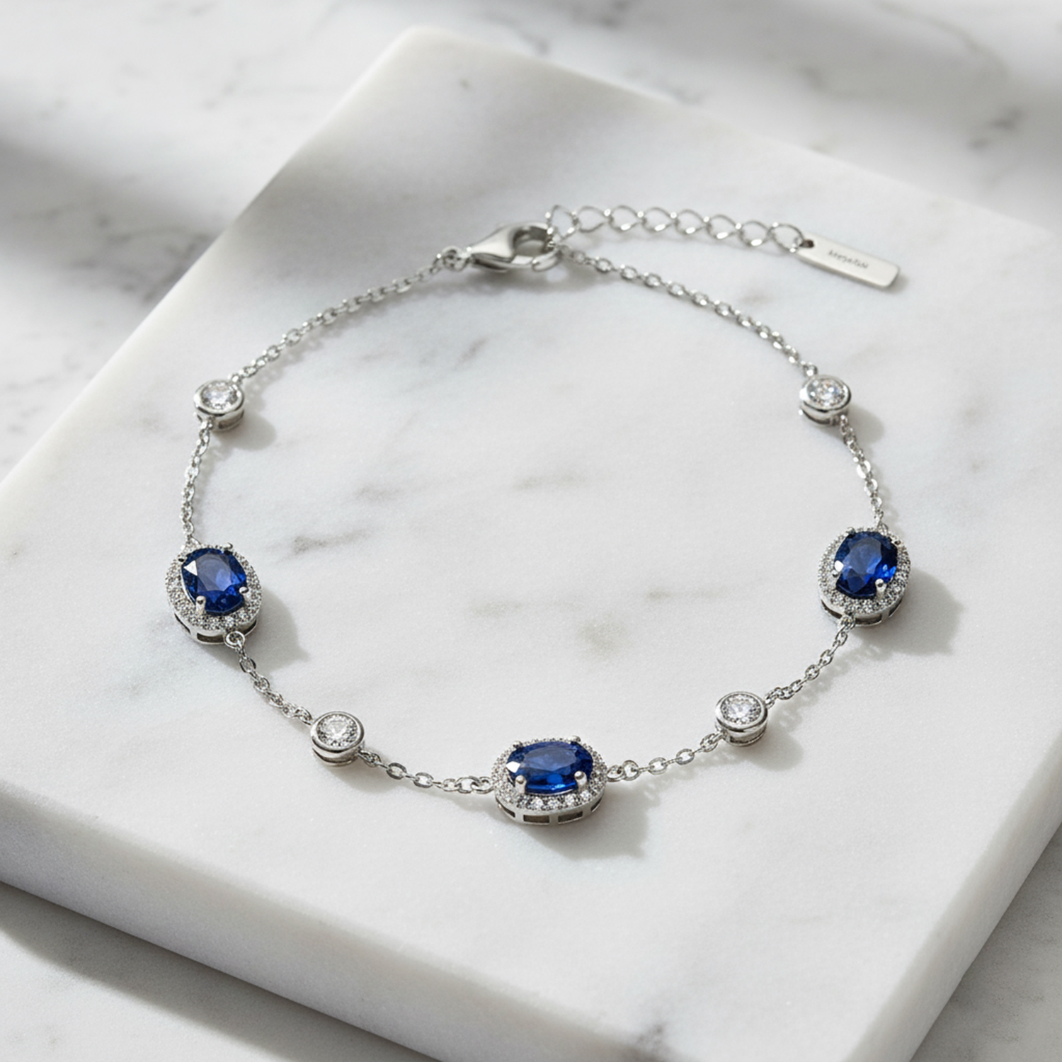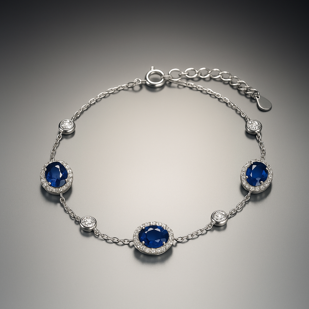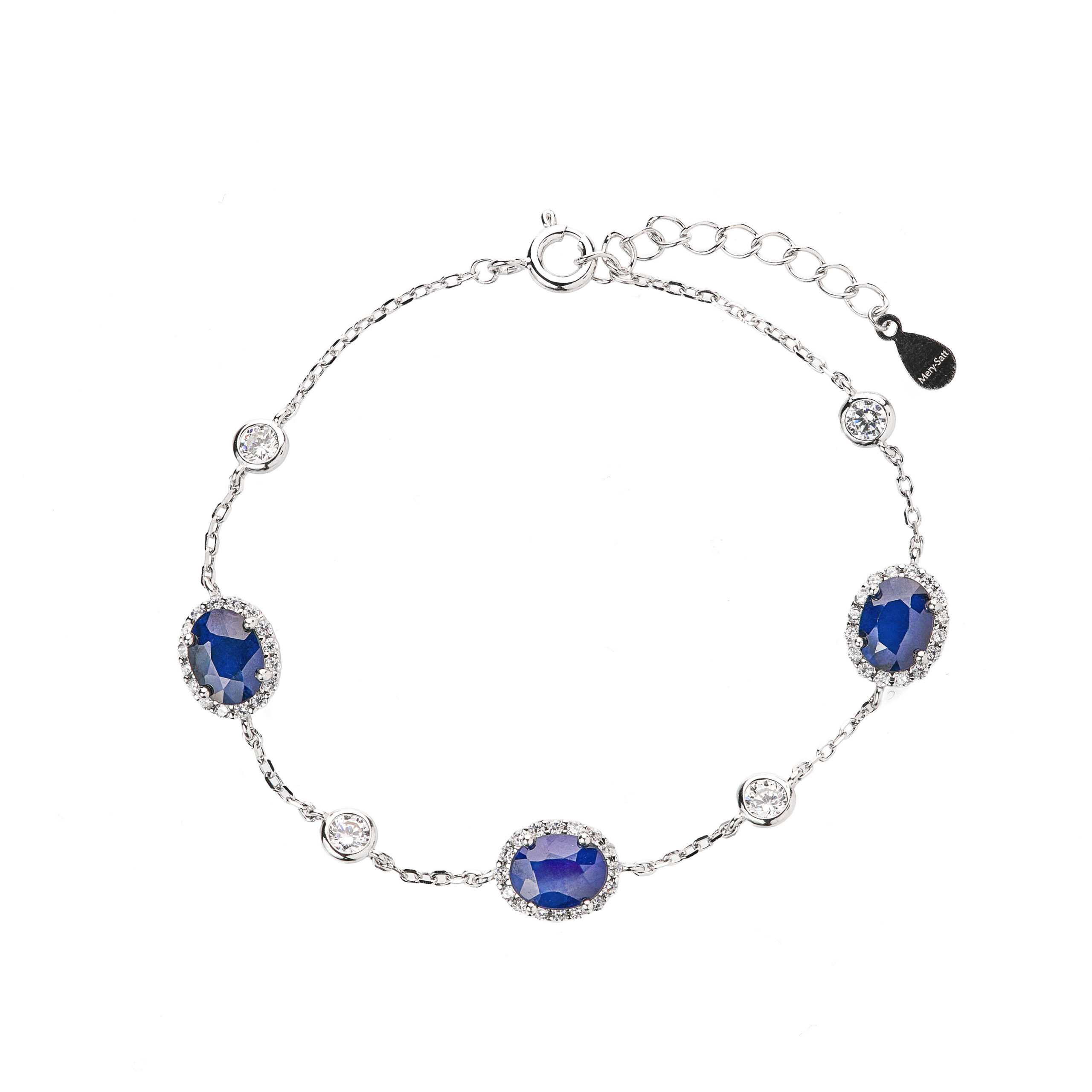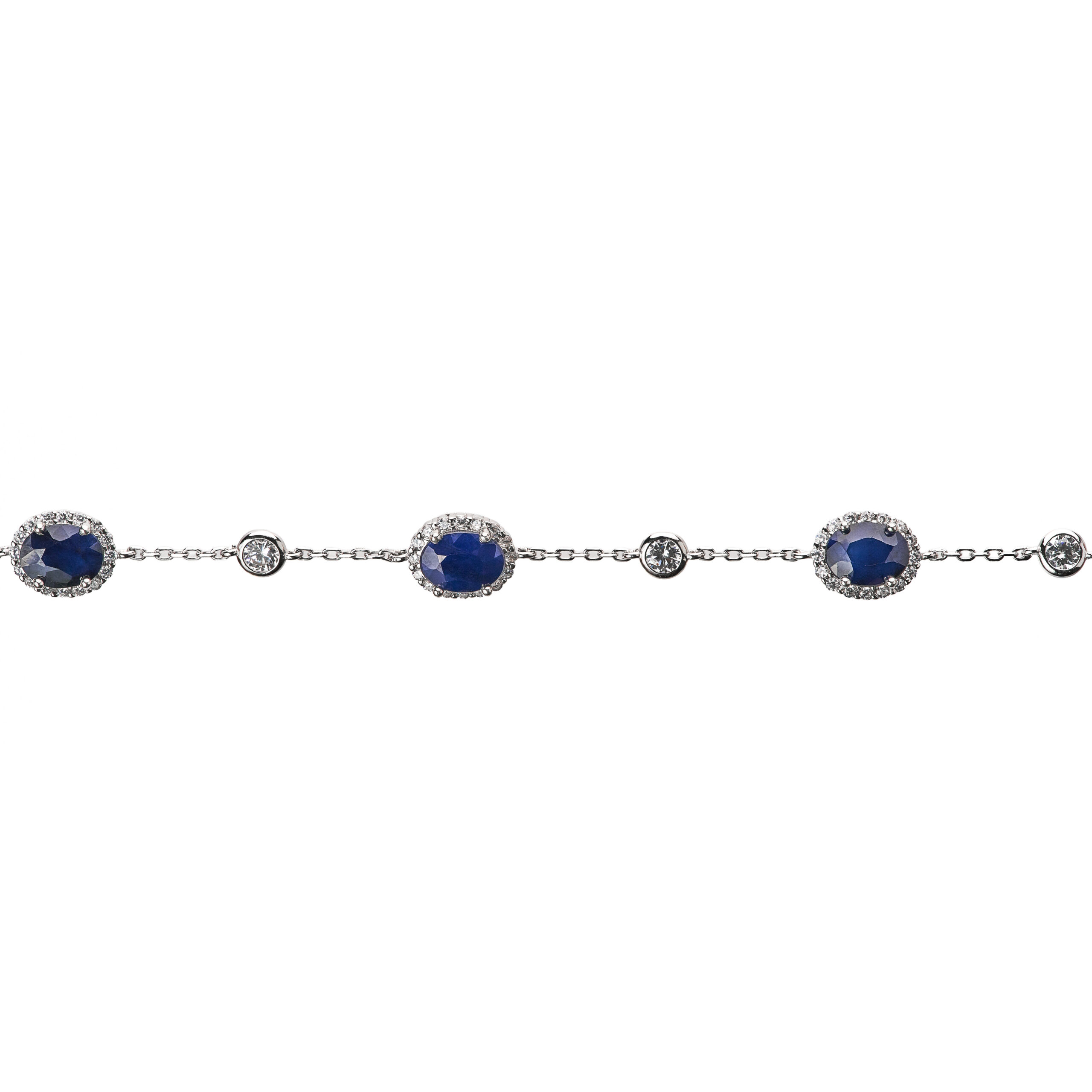Pulsera con 3 zafiros azules naturales corte ovalado con halo de circones blancos y 3 circonitas blancas engastadas en bisel, de plata esterlina 925 de eslabones delgados con Largo 20cm