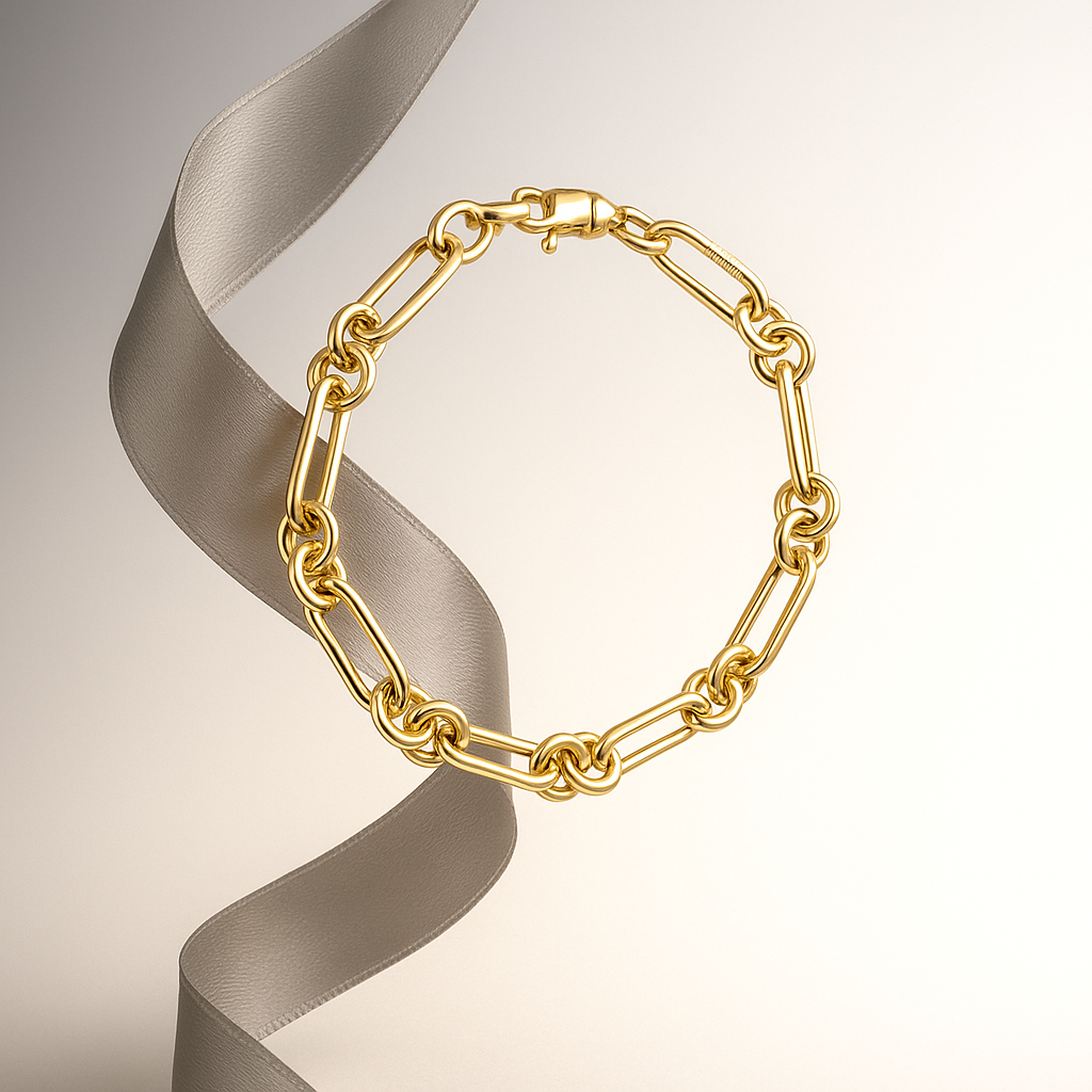 Pulsera de Oro amarillo 18k con diseño de eslabones huecos patron de 1 alargado y 2 redondos, con cierre mosquetón. Largo 19cm