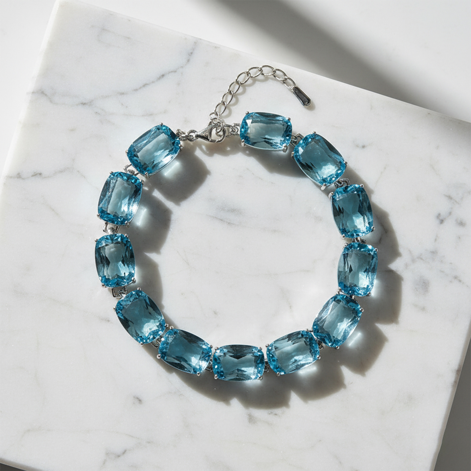 Pulsera de topacio azul natural facetas engastados en grifa de plata esterlina 925 con broche que de mosquetón. Largo 19cm