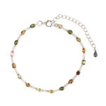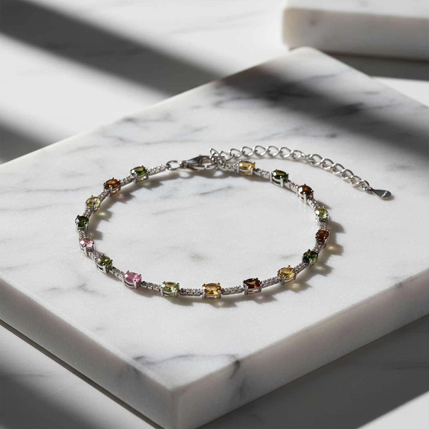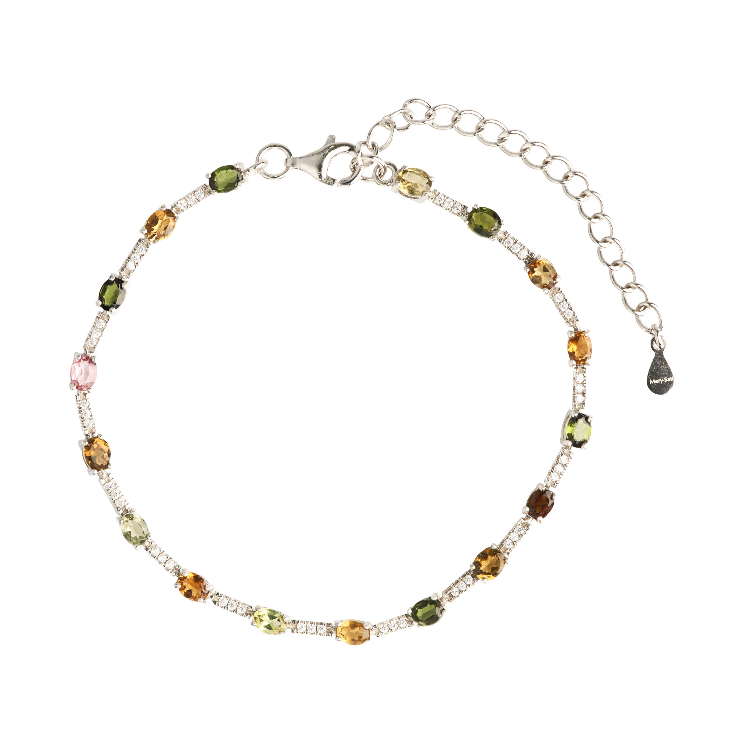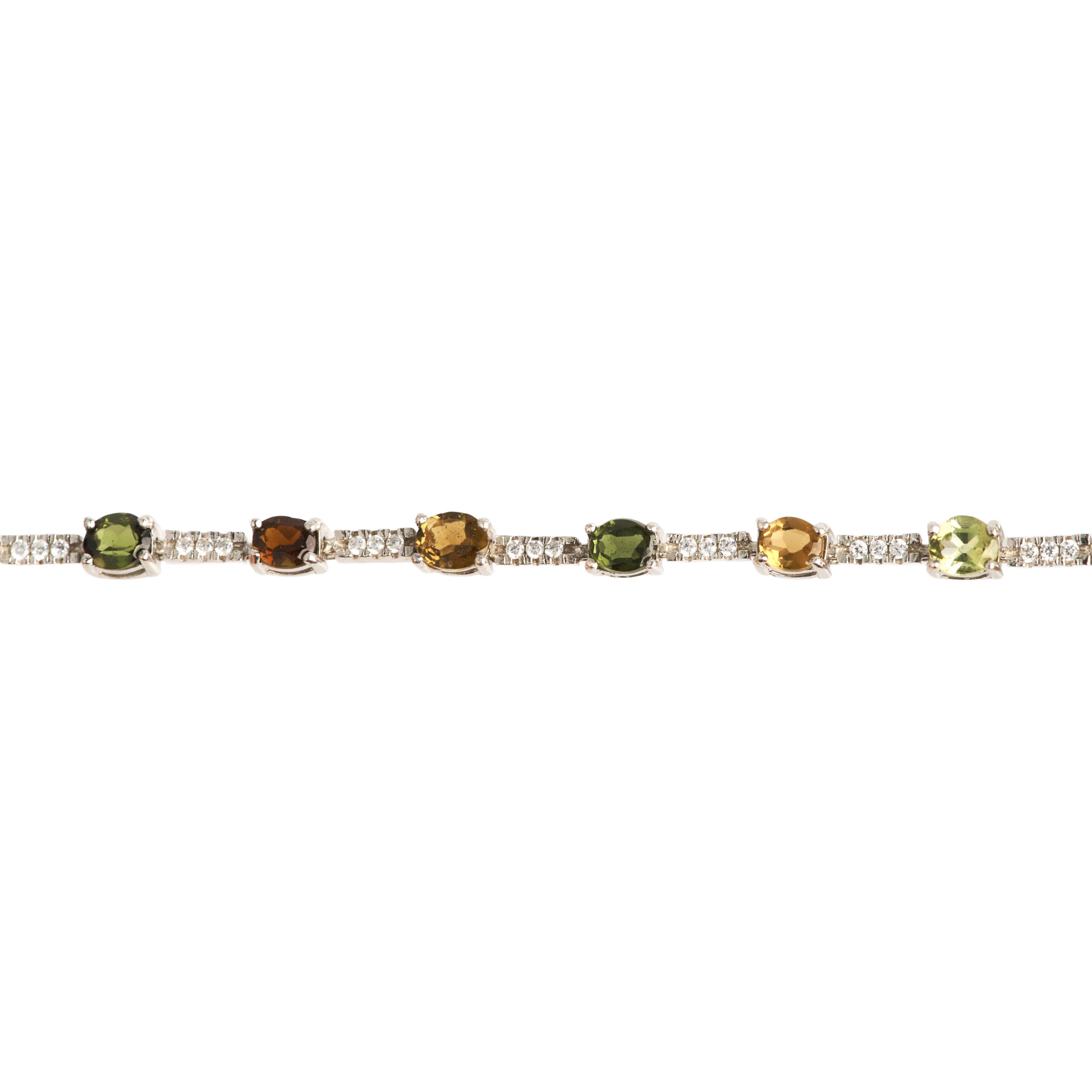 Pulsera de turmalinas  de colores en tonos cafe naturales ovalados engastadas en grifa estilo tenis y circonita cubica blanca. En plata esterlina 925, Largo 20cm