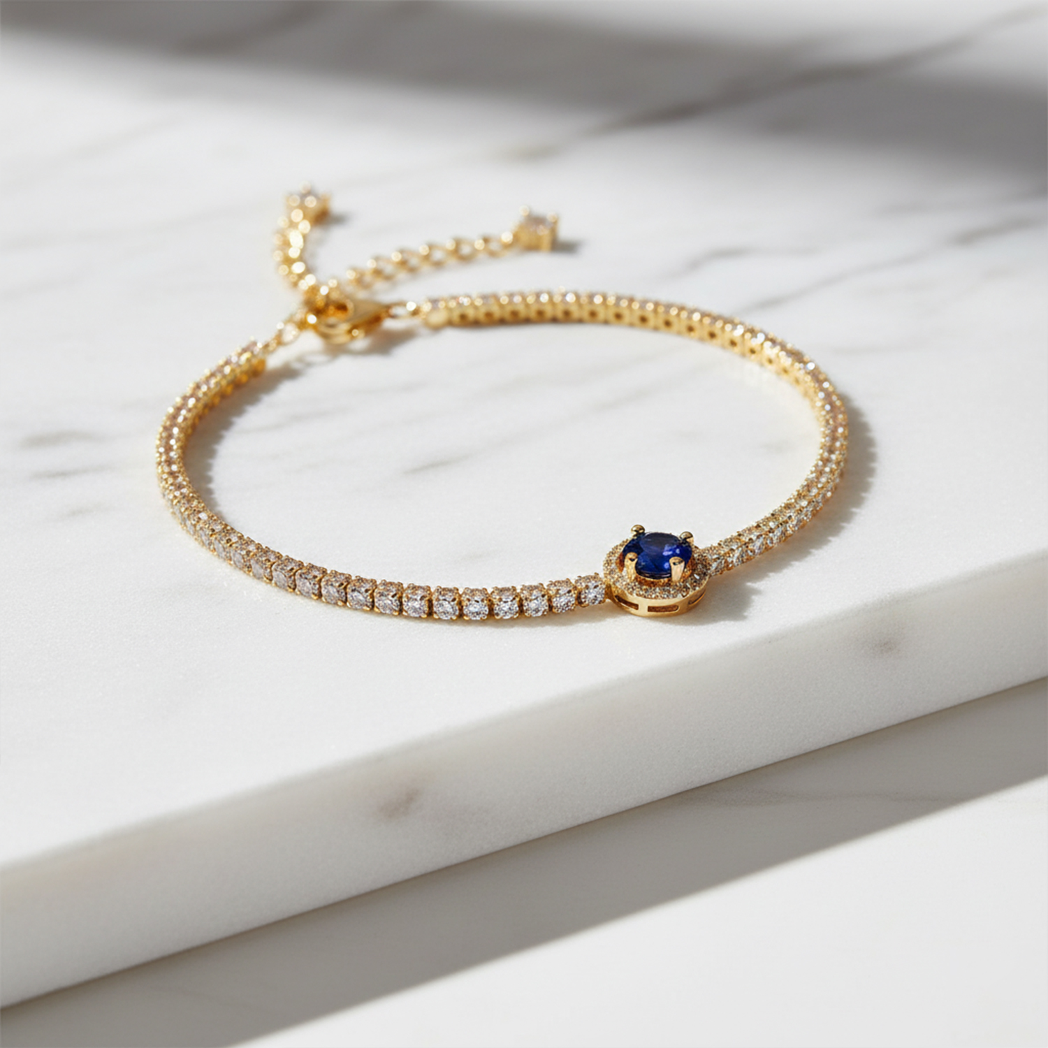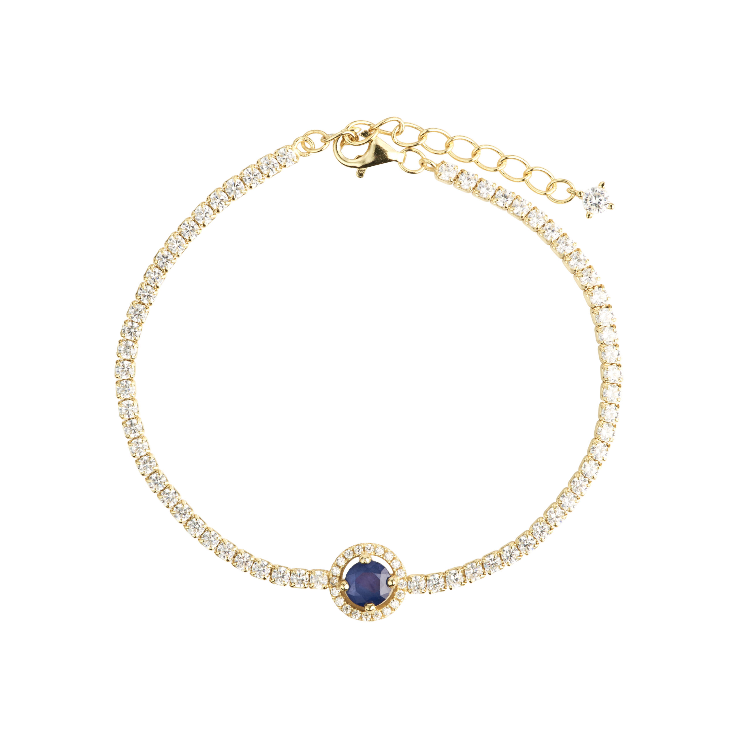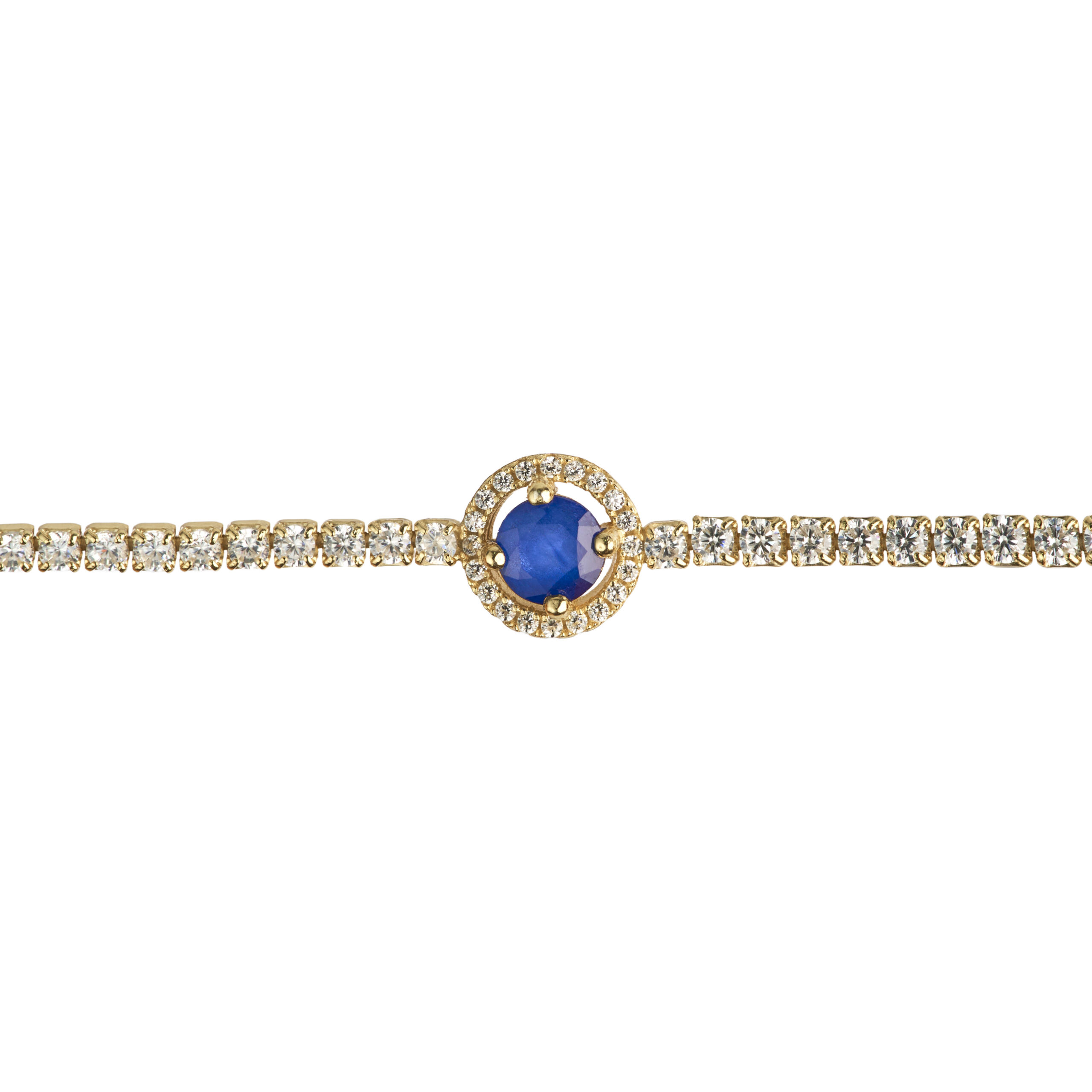 Pulsera de zafiro natural redondo engastado en grifa con un halo de circones estilo tenis de plata esterlina con recubrimiento de oro amarillo 18k. Largo 19cm