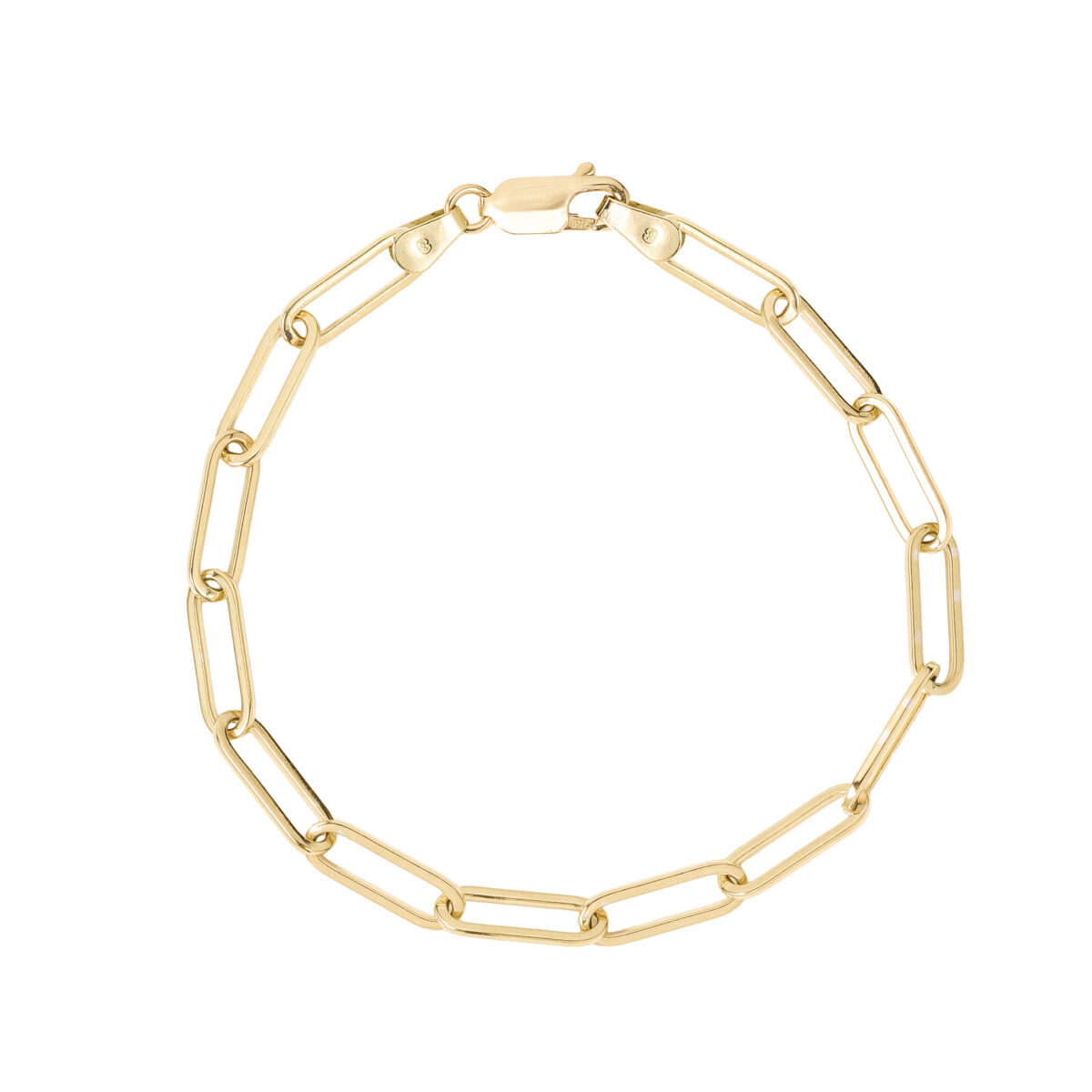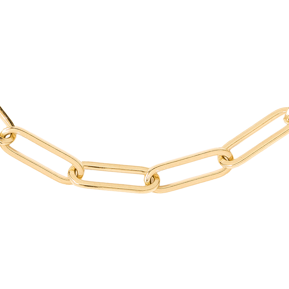 Pulsera de oro amarillo 18k con diseño de eslabones alargados planos estilo paper clip con cierre de mosquetón. Largo 19cm
