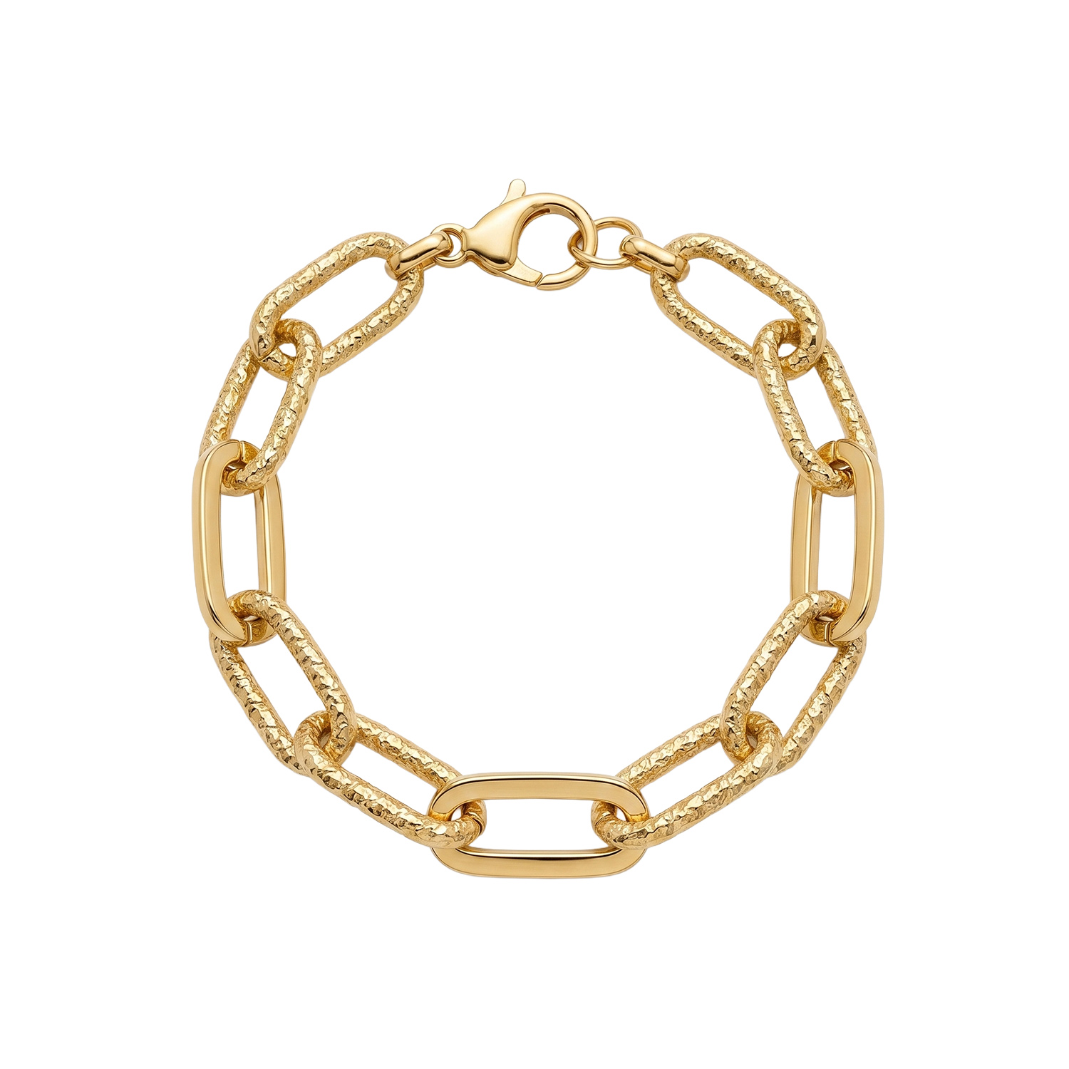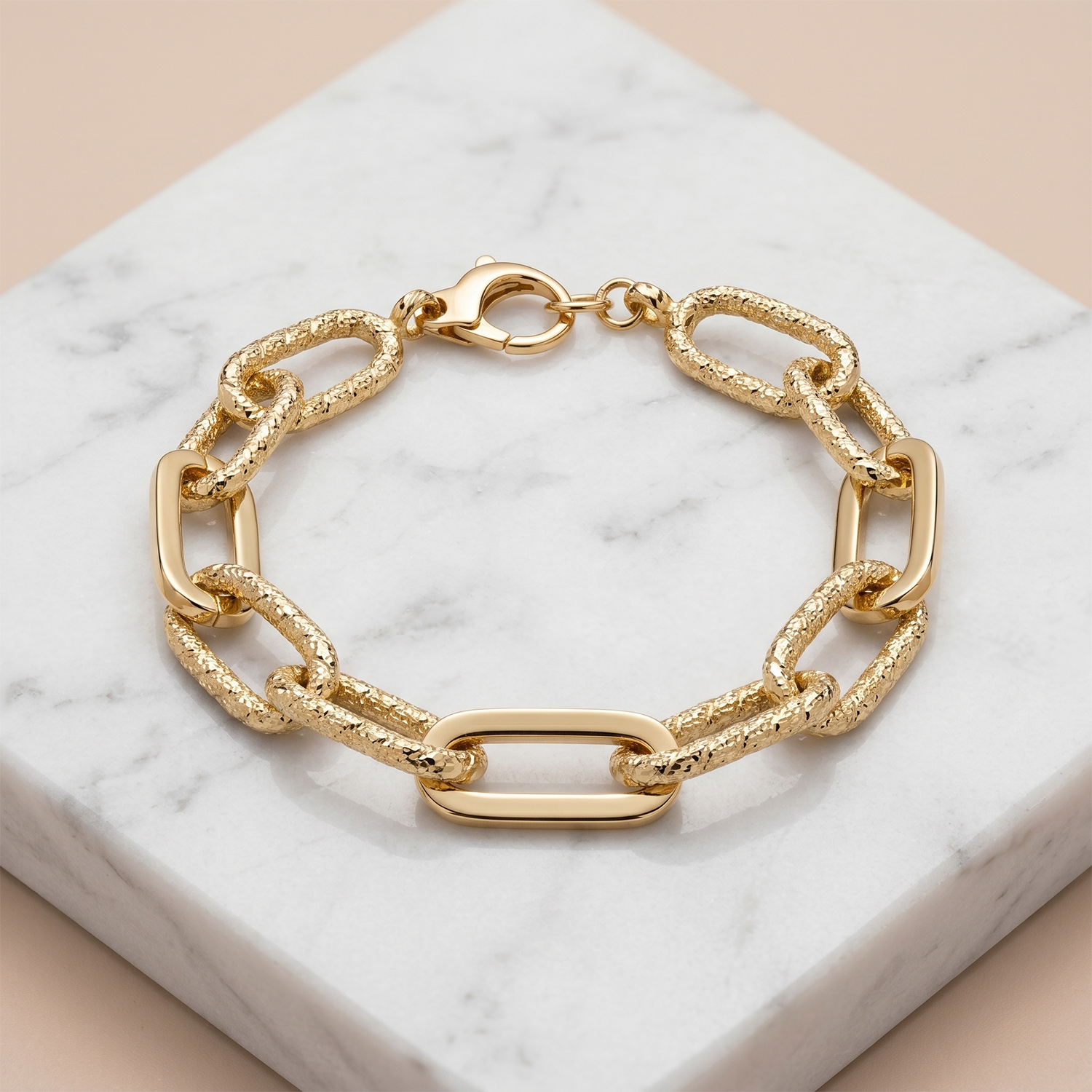 Pulsera de oro amarillo 18k con eslabones alargados, con textura y pulidos de 18 centimetros de largo peso 7.6gr.