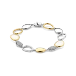 Pulsera TI SENTO modelo 23082MW de plata esterlina 925 con medallones ovalados con circonita cubica blanca, recubrimiento en oro amarillo 18k, platino y circonita lechosa. Largo 19cm